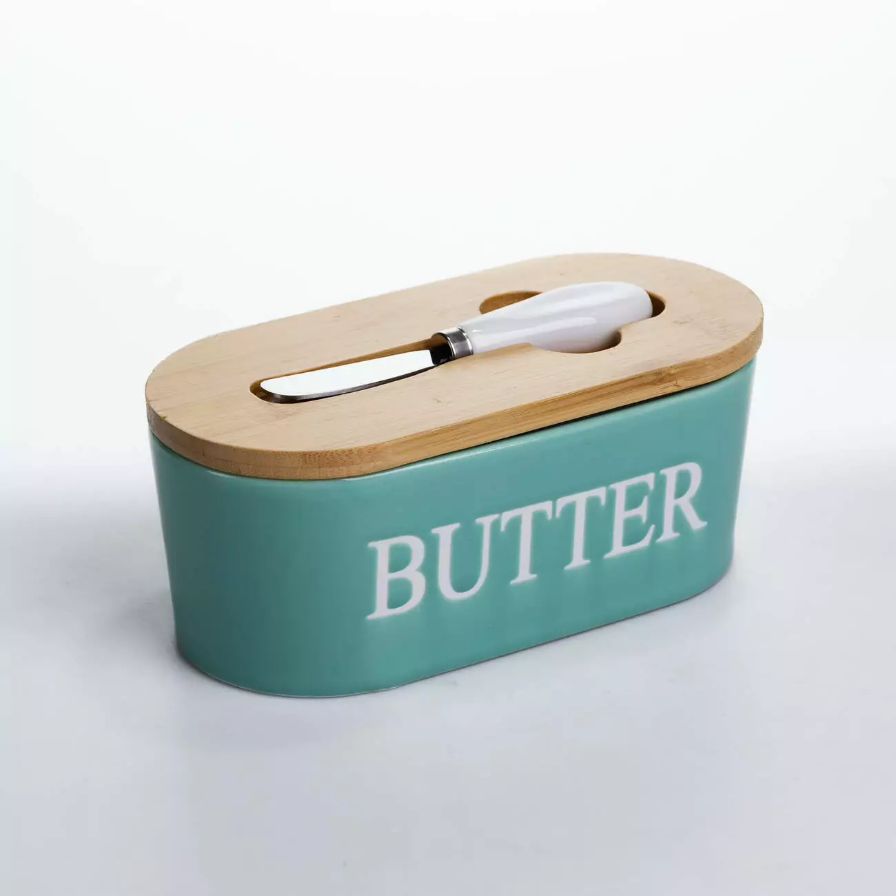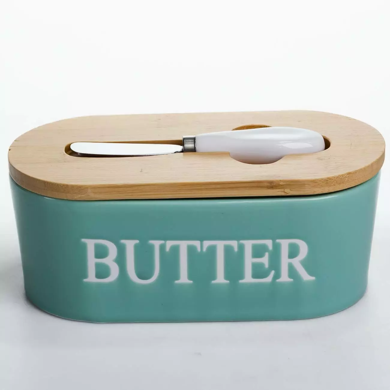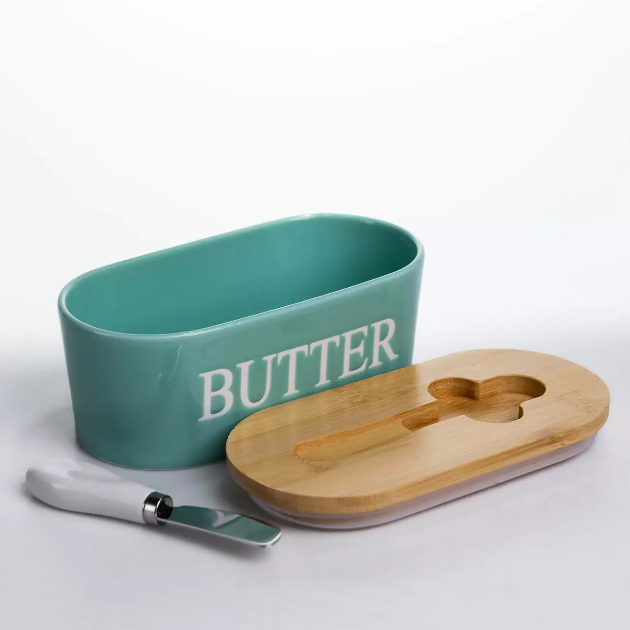 Маслянка порцелянова з бамбуковою кришкою та ножем для масла, бірюзовий