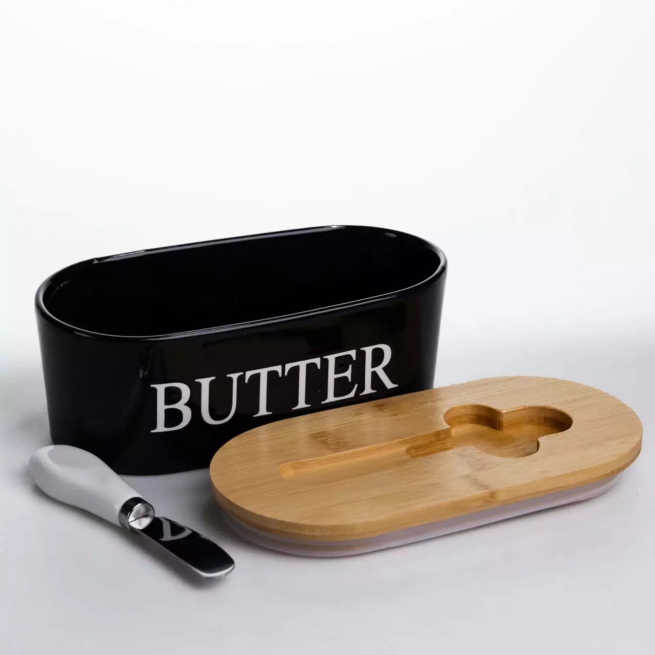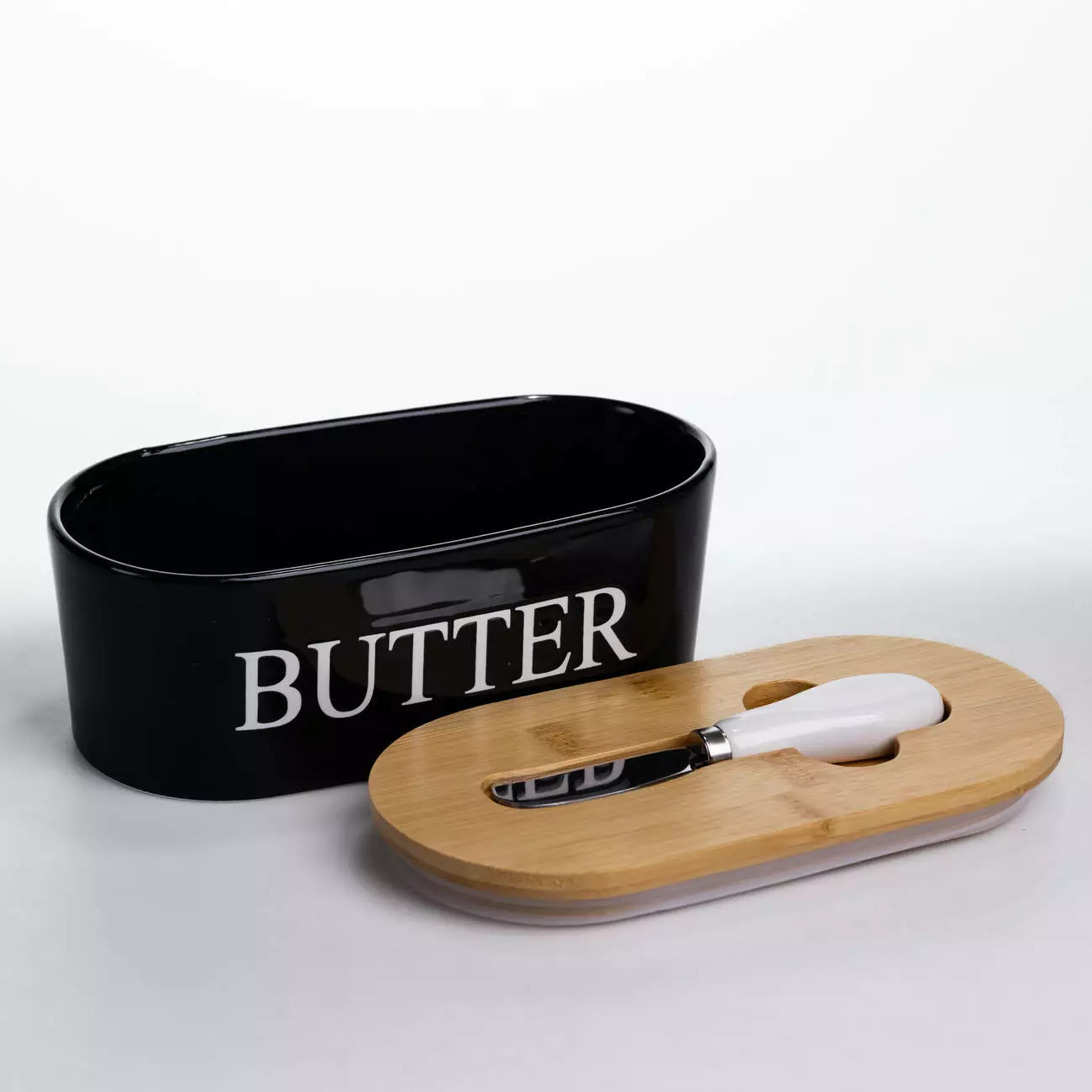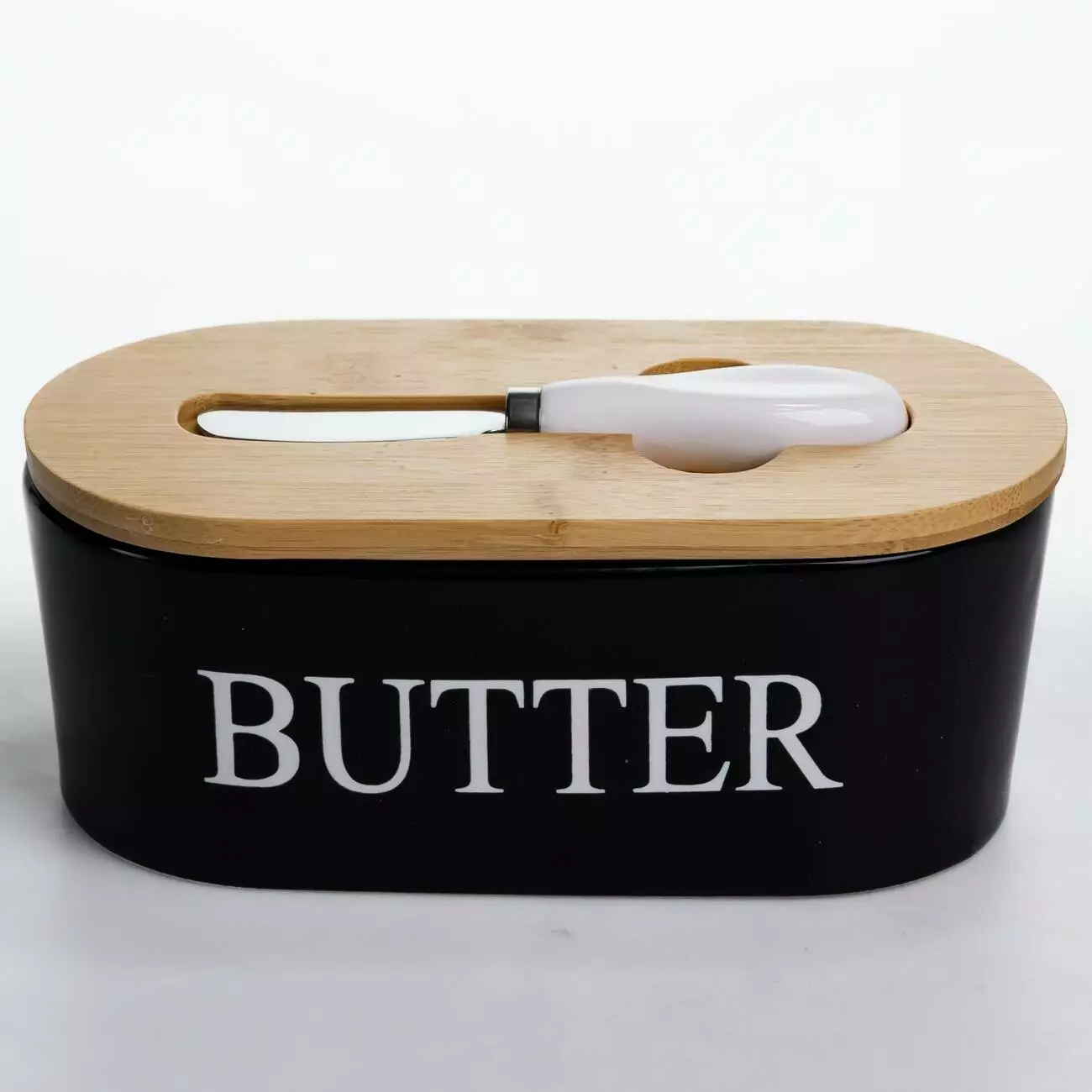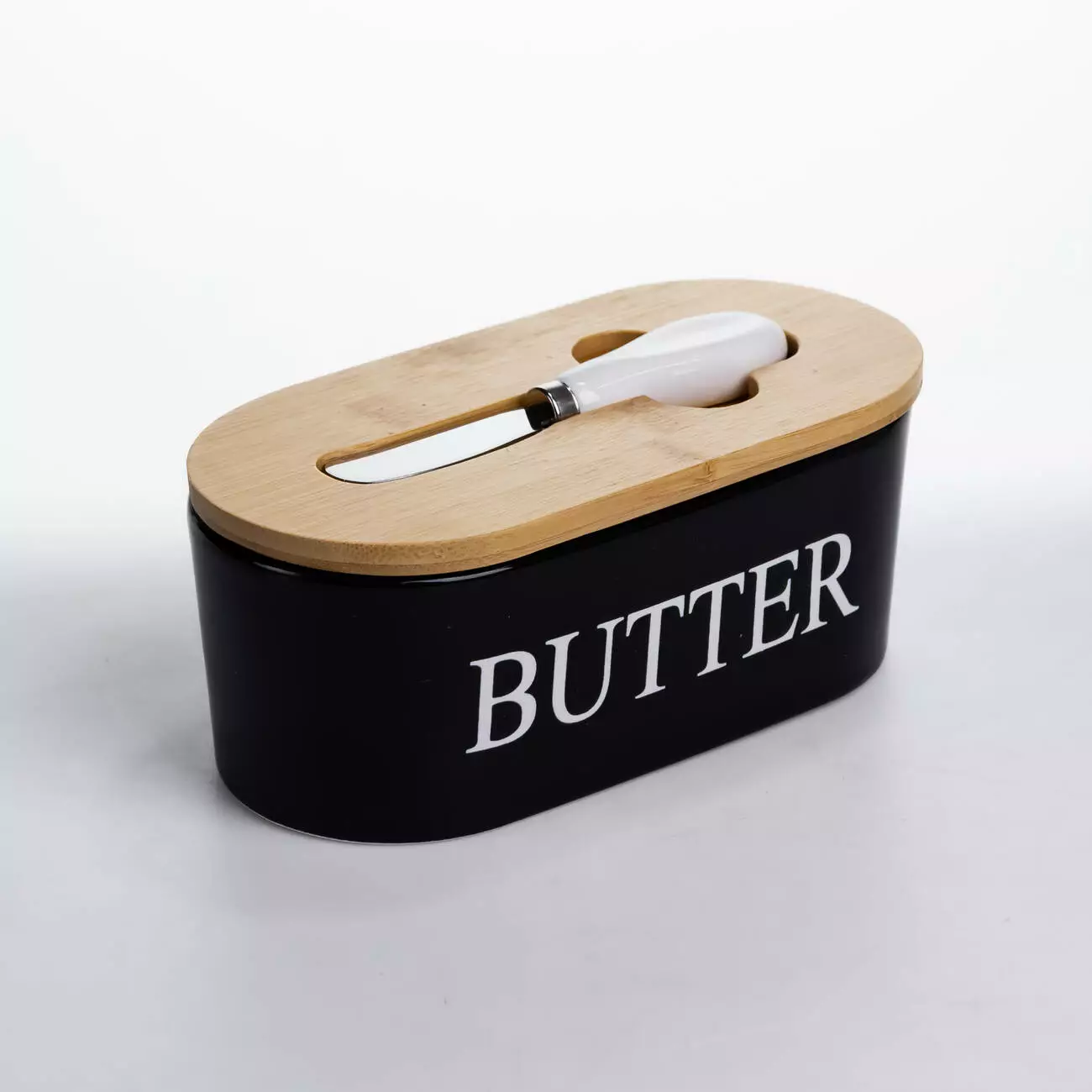 Маслянка порцелянова з бамбуковою кришкою та ножем для масла, чорний