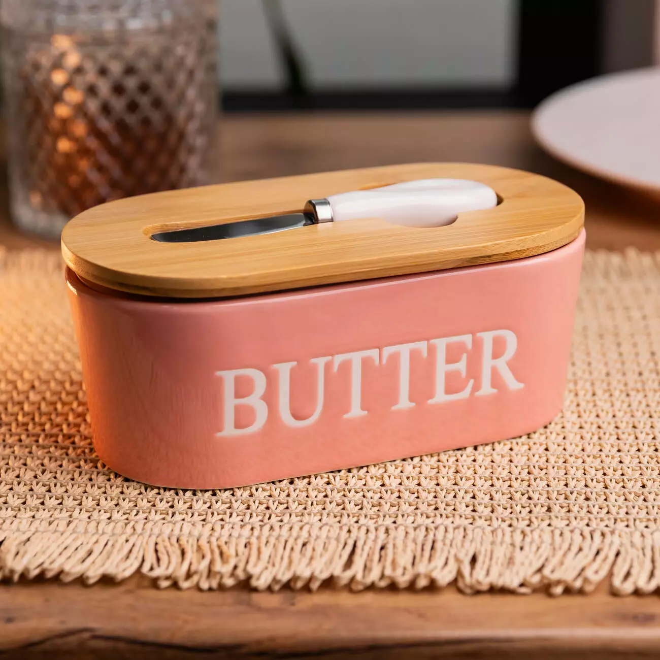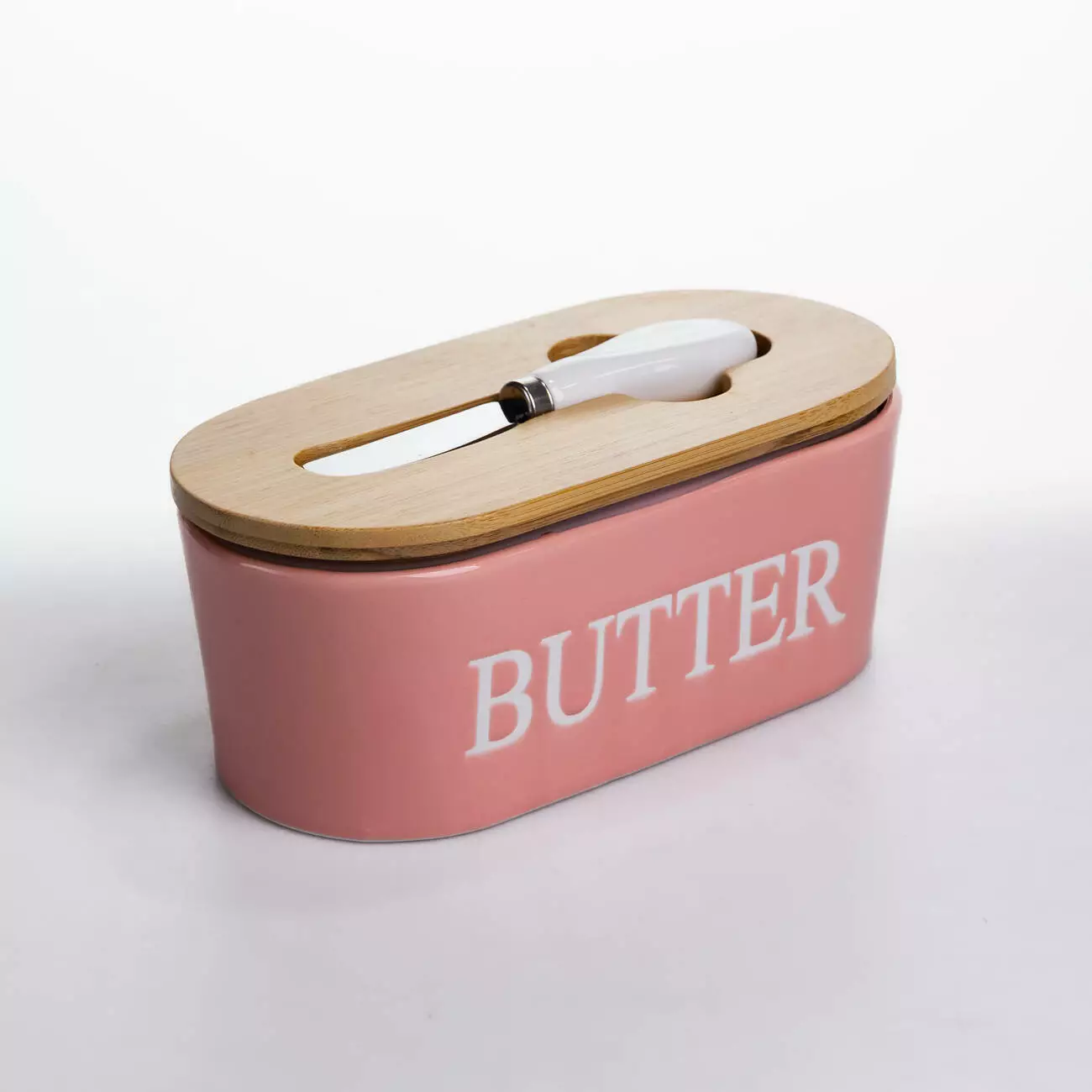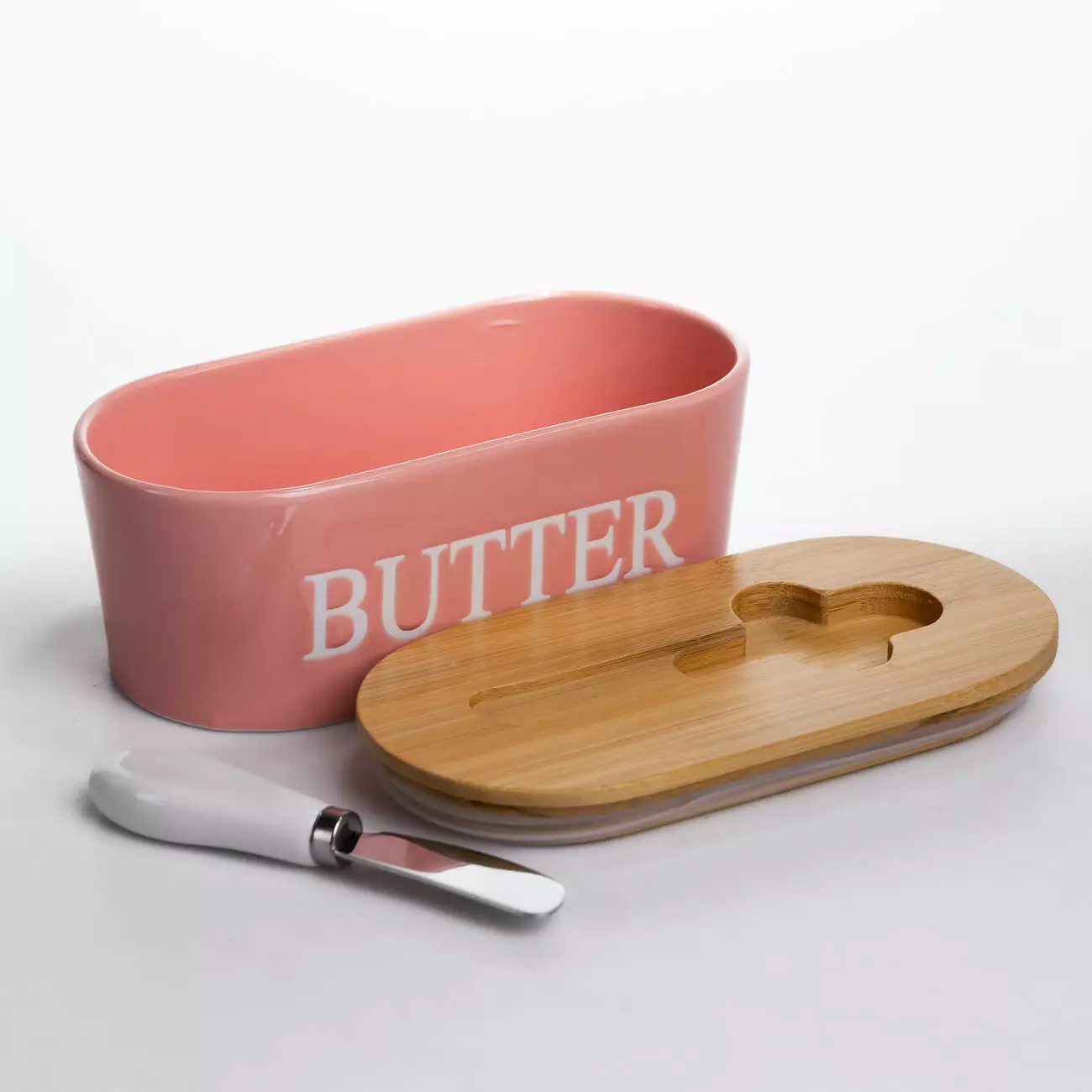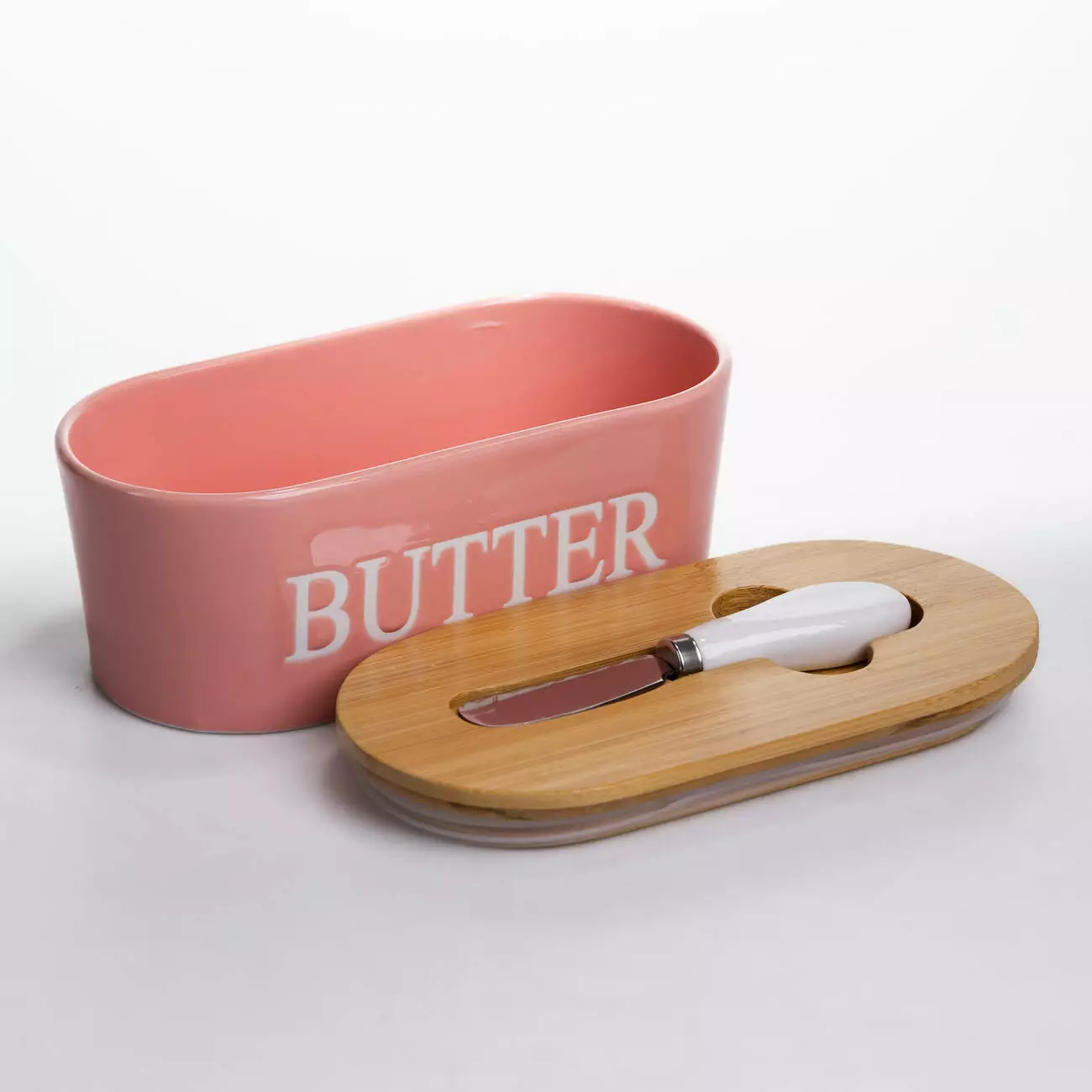 Маслянка порцелянова з бамбуковою кришкою та ножем для масла, рожевий