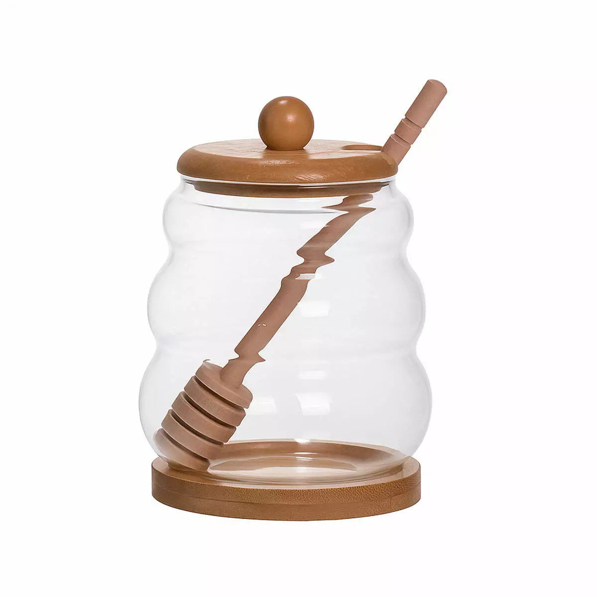Бамбукова ложка-веретино входить у комплект і вставляється у спеціальний отвір у кришці, що робить користування медом комфортним і акуратним. Усі елементи виготовлені з екологічно чистих матеріалів, стійких до впливу вологи та простих у догляді.