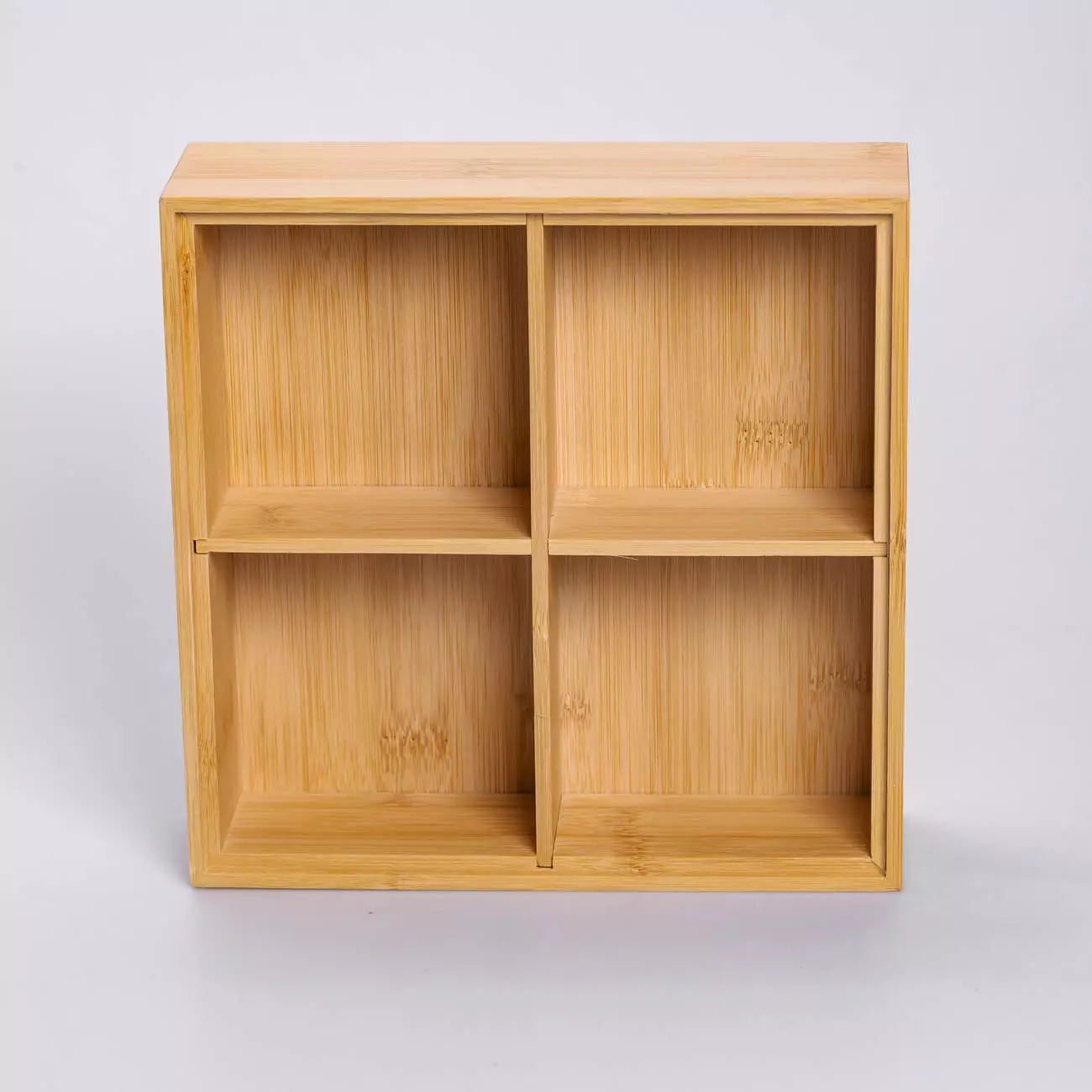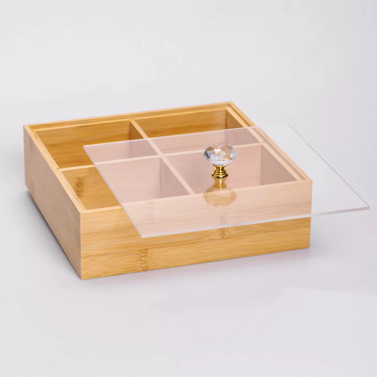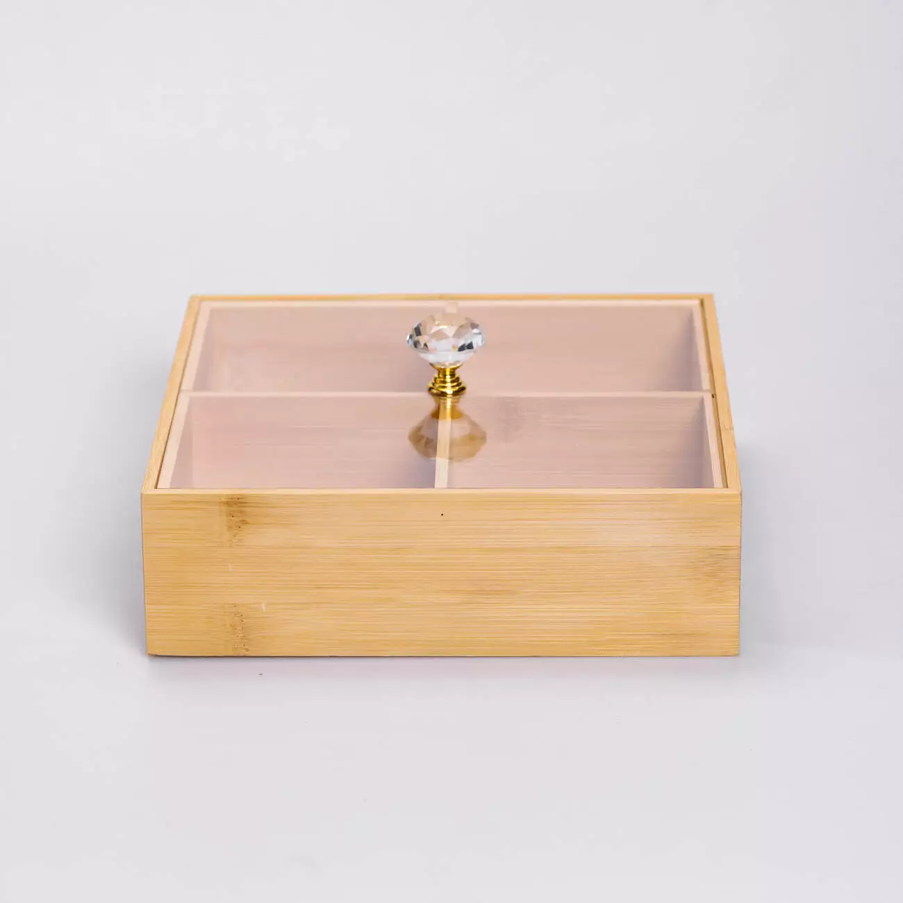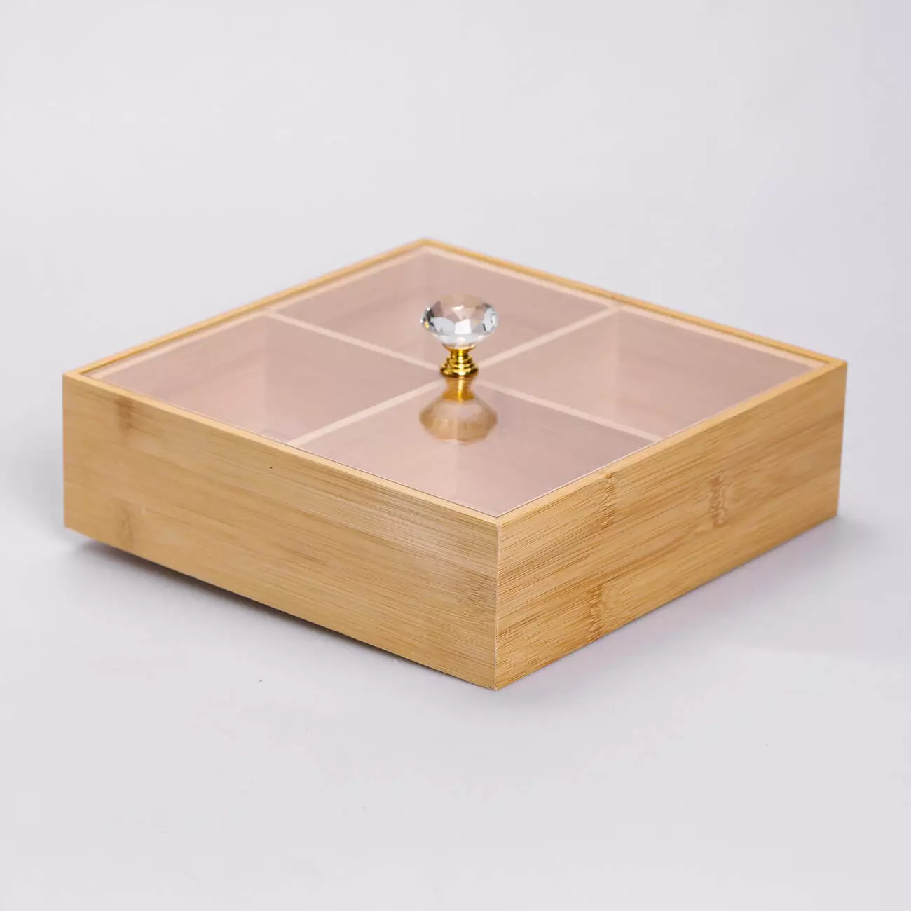 Бамбукова квадратна менажниця з кришкою стане зручним рішенням для сервірування столу та зберігання різних продуктів. Завдяки 4 окремим секціям можна розміщувати закуски, горішки, сухофрукти чи інші смаколики, зберігаючи їх окремо. Натуральний бамбук додає виробу екологічності та сучасного вигляду.