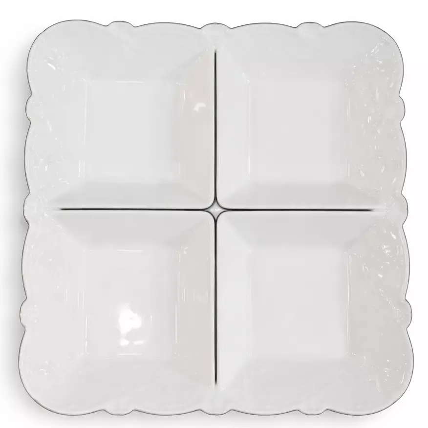 Класична менажниця на 4 секції призначена для одночасного подання різних видів закусок, соусів, горіхів або десертів. Виріб поєднує в собі естетику білої порцеляни та практичність роздільної подачі, що робить його затребуваним як у побуті, так і в ресторанному бізнесі.