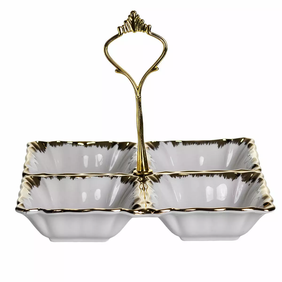 Порцелянова менажниця на чотири секції призначена для подачі закусок, соусів, горішків чи десертів. Виріб має квадратну форму з чітким поділом на окремі відділення, що дозволяє сервірувати кілька різних страв одночасно без змішування смаків. Центральна ручка полегшує перенесення та додає зручності під час використання.