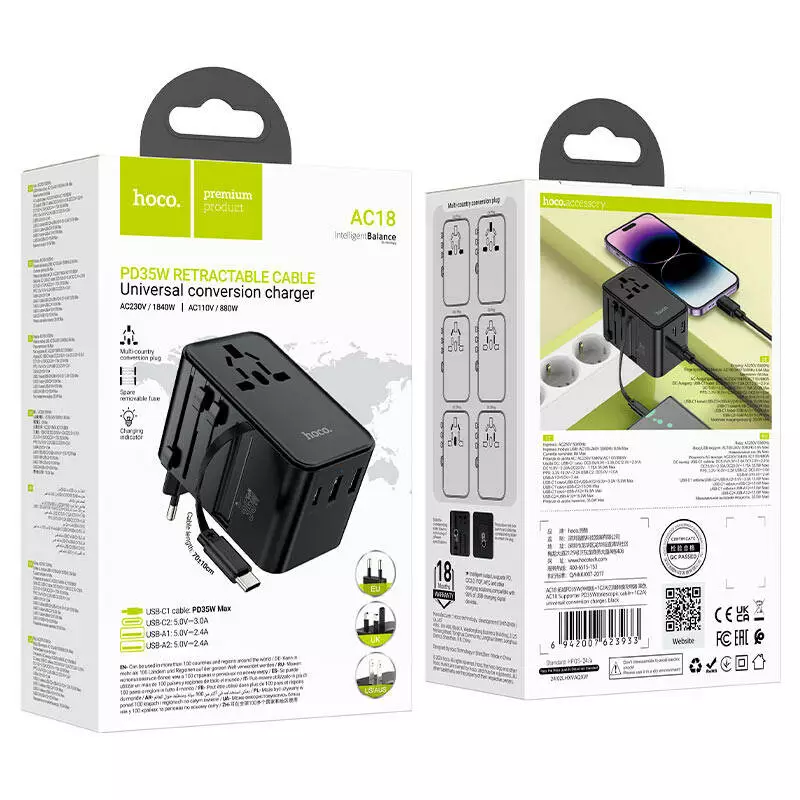 Мережевий фільтр HOCO AC18A на 1 розетку + 2 USB + USB-C, 35W,