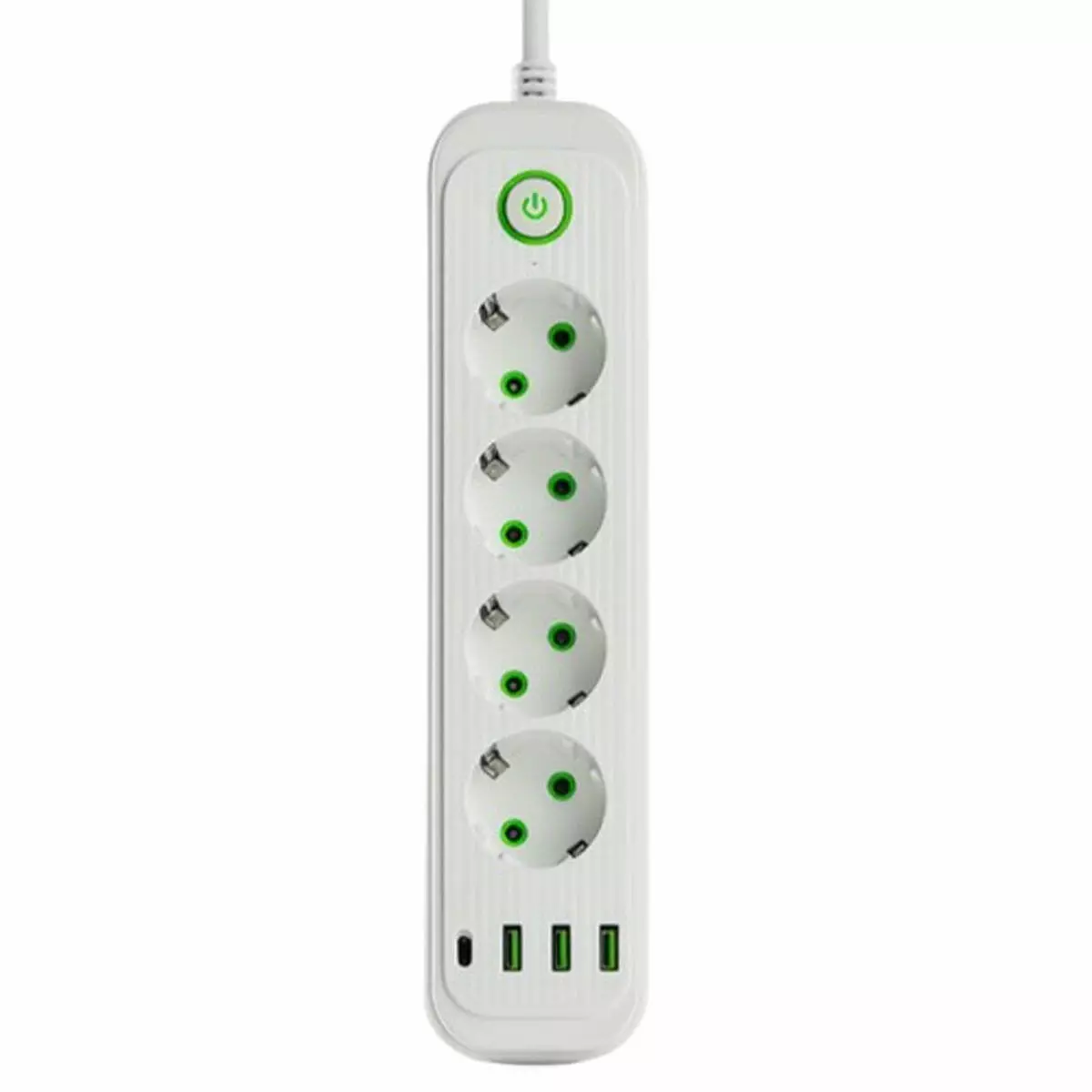 Корпус виконаний із вогнестійкого ABS-пластику у вертикальному форматі, що допомагає економити місце та зручно розміщувати подовжувач. Чотири євророзетки розташовані для комфортного одночасного використання без перекривання. На передній панелі знаходяться три USB-порти та один Type-C для заряджання смартфонів, навушників, павербанків та інших гаджетів.