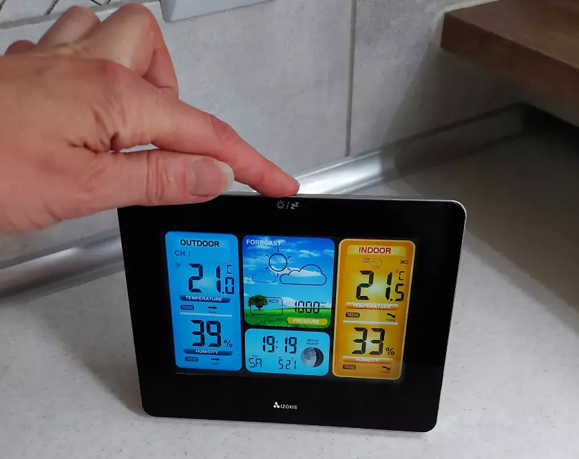 Обеспечивает непрерывное отображение точной информации о дате, времени, температуре, атмосферном давлении и влажности. Станция имеет подсветку - при питании изделия от сетевого кабеля она горит постоянно, а при использовании батареек - в течение 15 секунд, а затем переходит в спящий режим, что позволяет снизить расход батареи. Подсветка включается прикосновением - достаточно положить палец на верхнюю часть станции.
