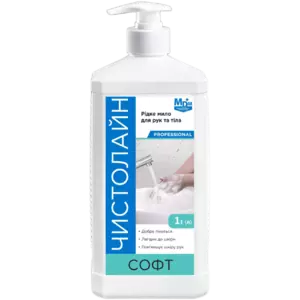 Рідке мило «Чистолайн Софт» — це готовий до використання м’який гігієнічний засіб для щоденного миття рук і тіла. Формула на основі делікатних ПАР із додаванням гліцерину забезпечує ефективне очищення, не пересушує шкіру та підтримує її природний ліпідний баланс. Засіб має приємну консистенцію, ніжний аромат і може використовуватись як у рідкому вигляді, так і у формі піни при застосуванні дозатора. Підходить для всіх типів шкіри, у тому числі чутливої та дитячої.