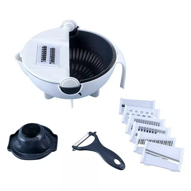 Супер универсальная многофункциональная овощерезка Magic Rotate 9 в 1 которая подойдет на все случаи жизни !!! 3 × Жюльен Слайсер 2 × прямой слайсер 1 × волнистый слайсер 1 × шлифовальный станок 1 × Овощечистка 1 × Защита рук 1 × Съемная сливная корзина 1 × пищевой контейнер