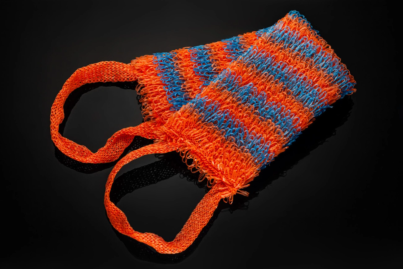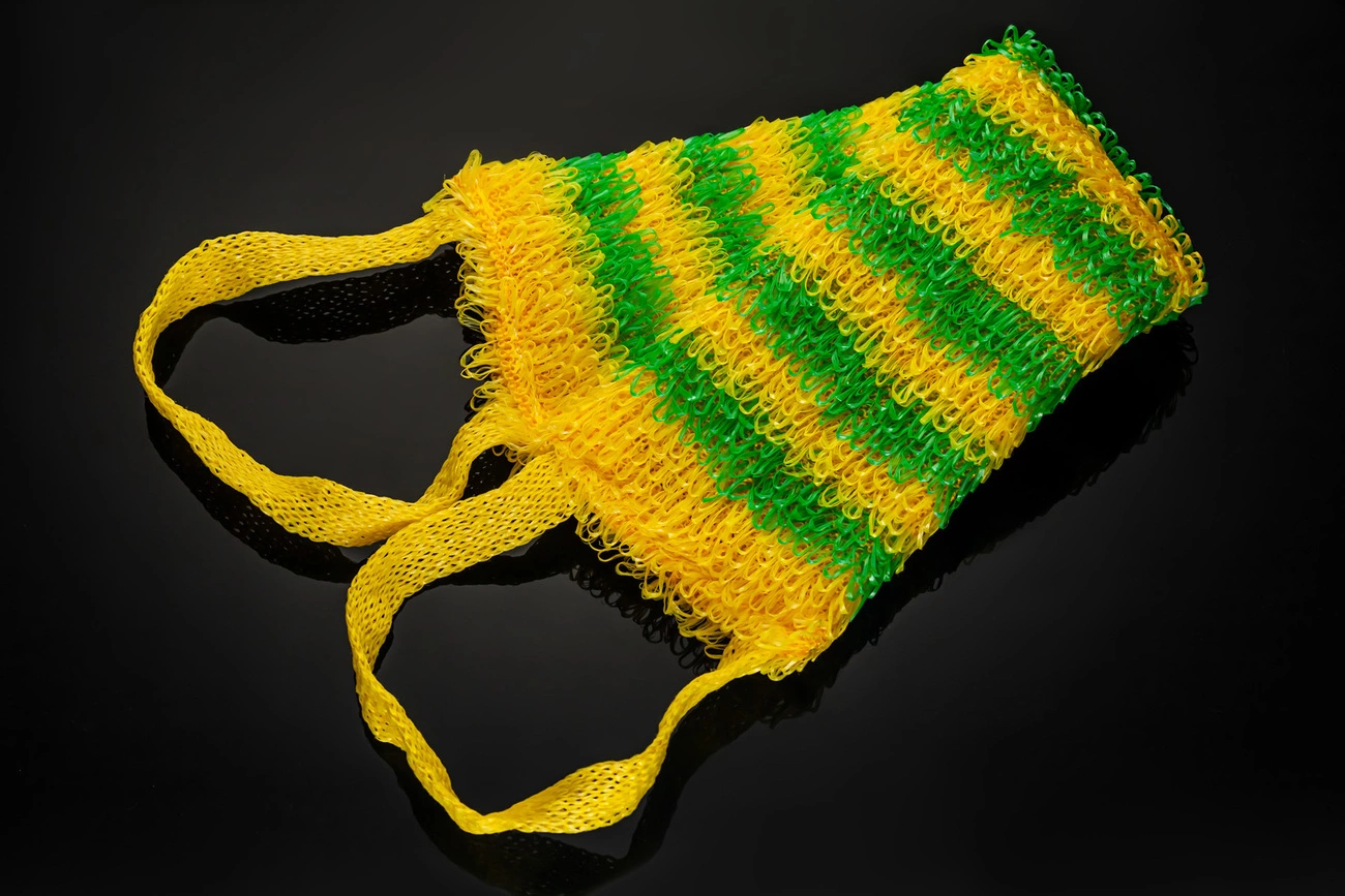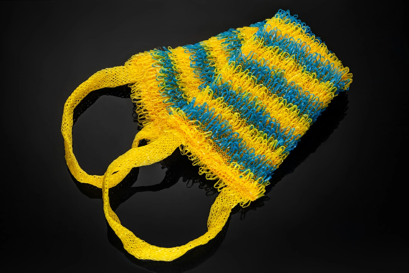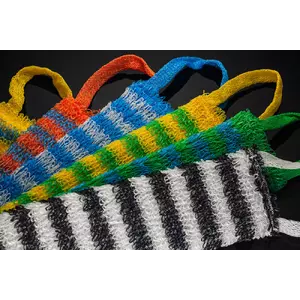 Зебра - жаккард цієї мочалки формується довгими, спрямованими в одну сторону петлями, які утворюють поперечні різнокольорові смуги двох кольорів. Виріб має ступінь жорсткості "Medium", довгі, міцні ручки, завдяки яким зручно мити важкодоступні ділянки тіла. Поролонова вставка вшивається всередину мочалки і займає весь її внутрішній простір. Завдяки цьому в процесі використання виходить пишна мильна піна.
