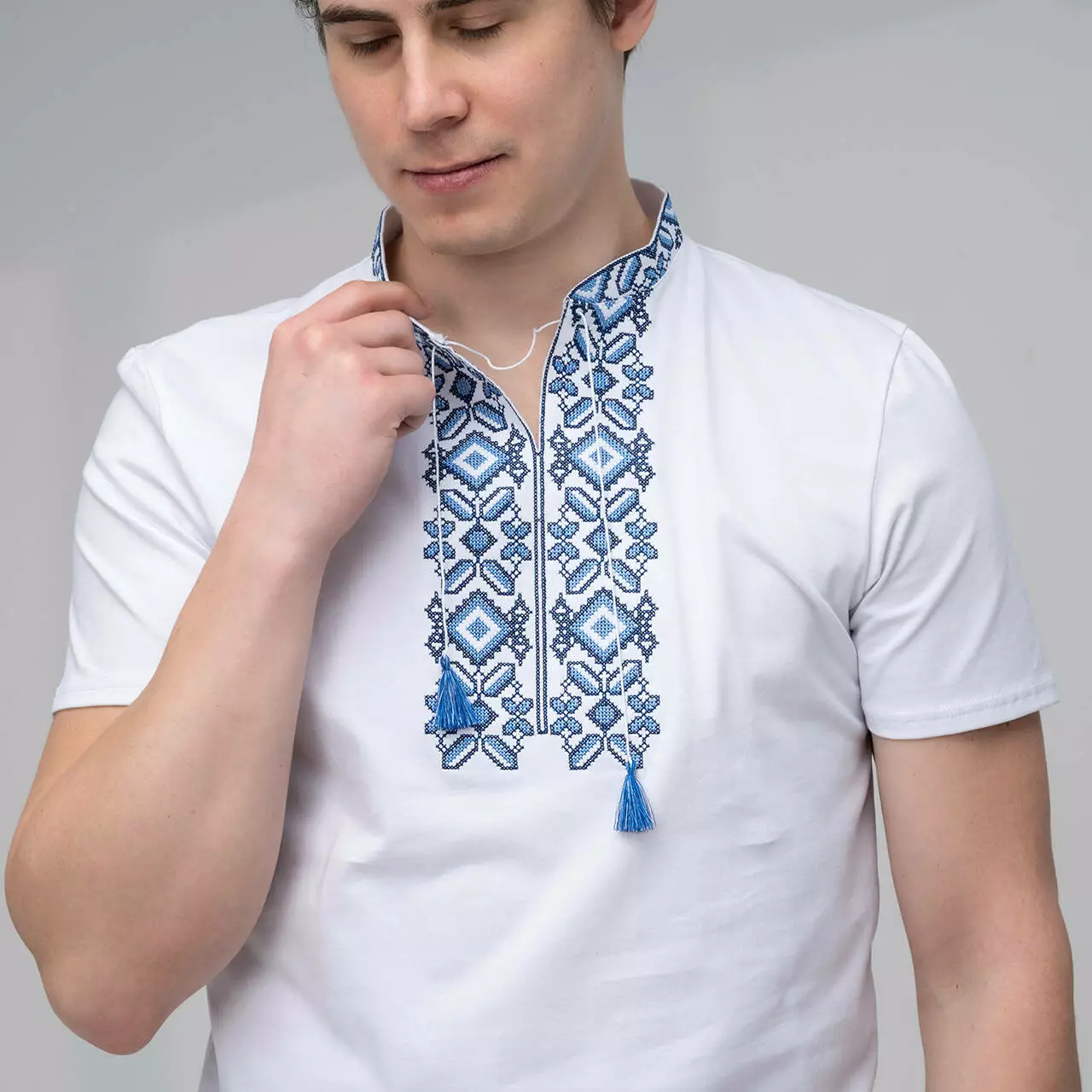 Вишиванка для українця - це не просто одяг, це стан душі, код нації - синонімів багато. І тому доволі часто важко знайти ту модель футболки із вишивкою, яка буде підкреслювати стан душі власника та характер. І саме така модель є у нас - це вишита футболка на короткий рукав Гетьман. Модель виконана у білому кольорі із ніжною синьо-блакитною вишивкою, кутасика та комірцем стійкою.