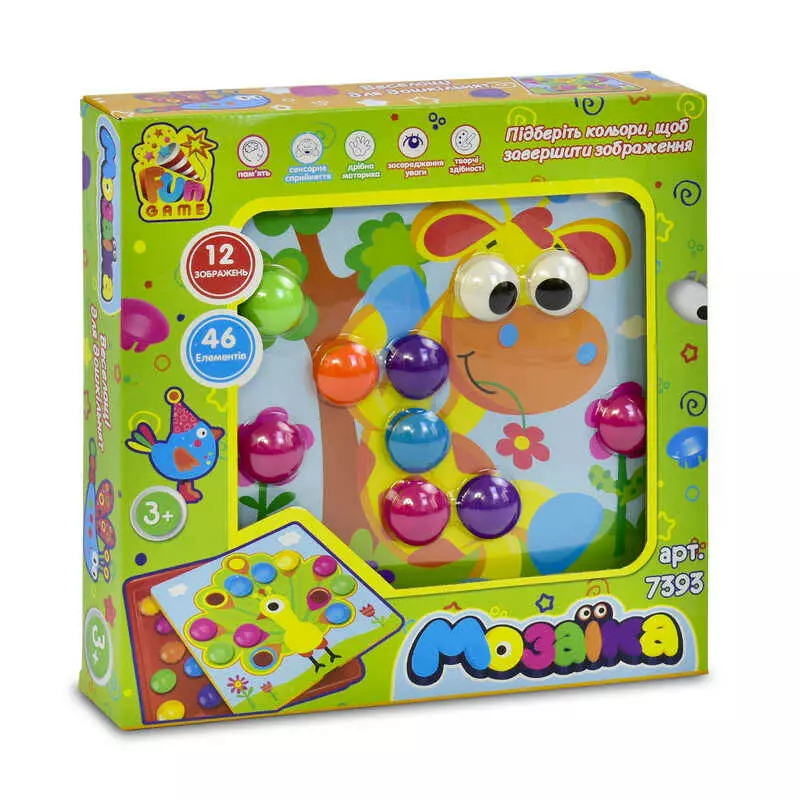 Створювати з безлічі дрібних деталей нову картинку неймовірно захоплююче, тому дітям так подобаються мозаїки! Мозаїка 7393 від Fun Game допоможе тренувати посидючість, пам'ять дитини, логіку, розвивати уяву і дрібну моторику рук. У набір входить 12 платформ з малюнками і 46 яскравих елементів мозаїки (діаметр 1 елемента 3 см.) Кольорові елементи мозаїки необхідно підібрати таким чином, щоб доповнити і завершити зображення на платформі.