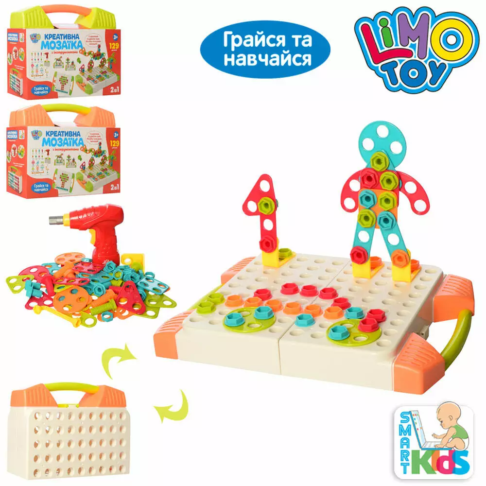 Фотография 1 товарной позиции интернет-магазина детских игрушек www.smarttoys.com.ua Мозаїка M 5480 129дет.,шуруповерт-оберт.насадка, 2кольори, валіза,бат., карт.оберт., 27-20-10см.