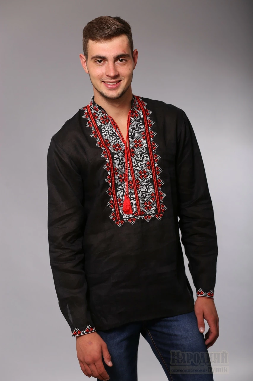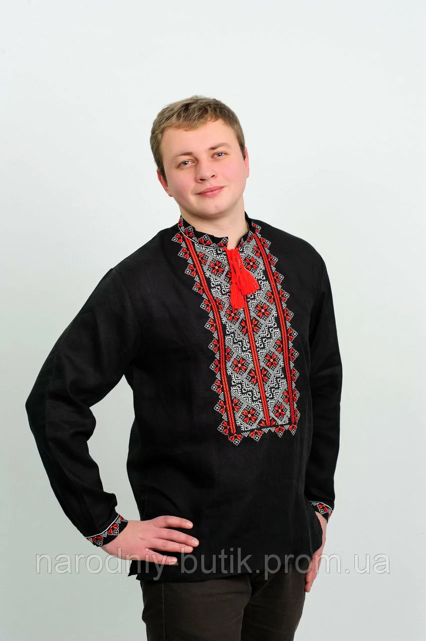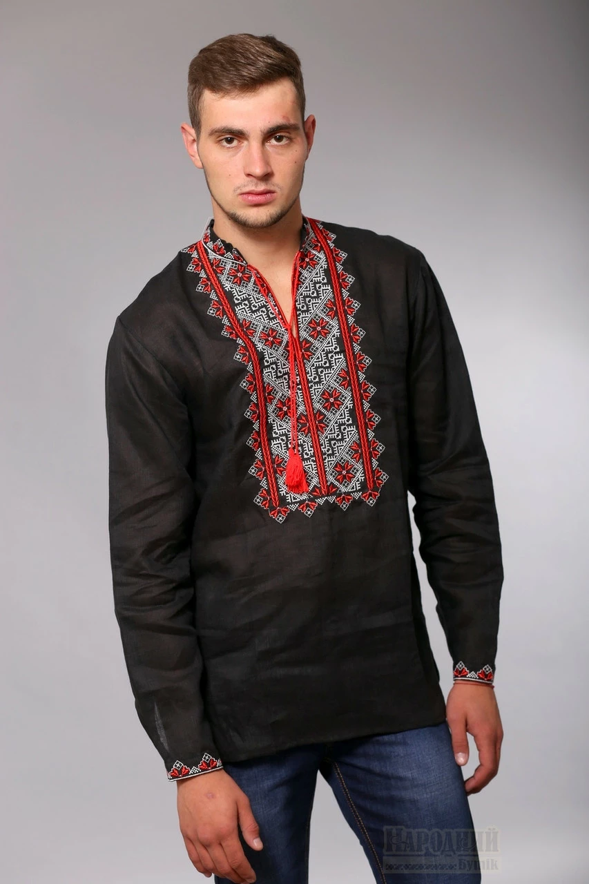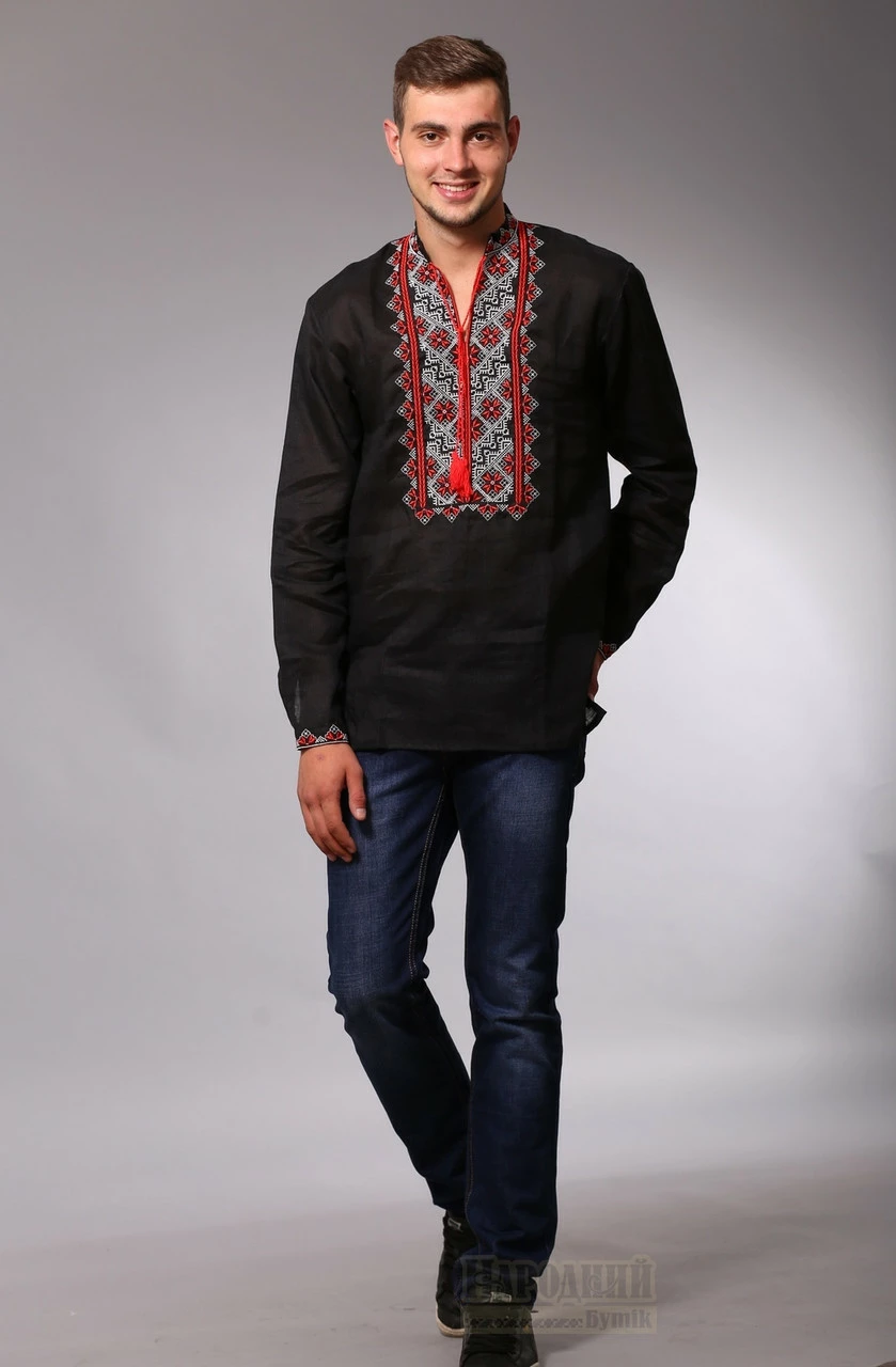 Вышитая мужская сорочка, черный лен, красная вышивка