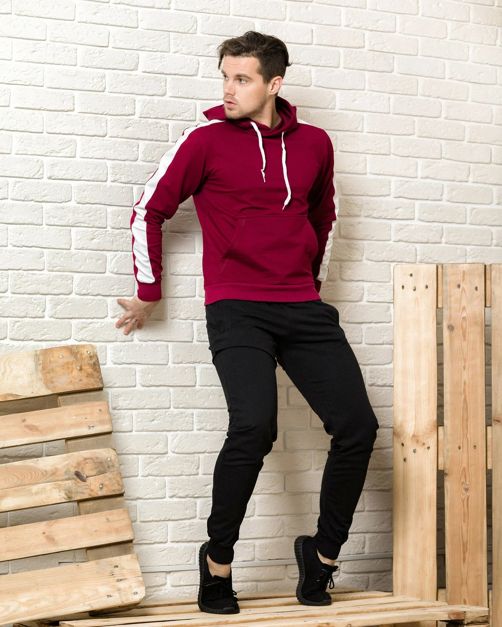 Мужской спортивный костюм (бордовая худи с лампасами и серые спортивные штаны с лампасами)