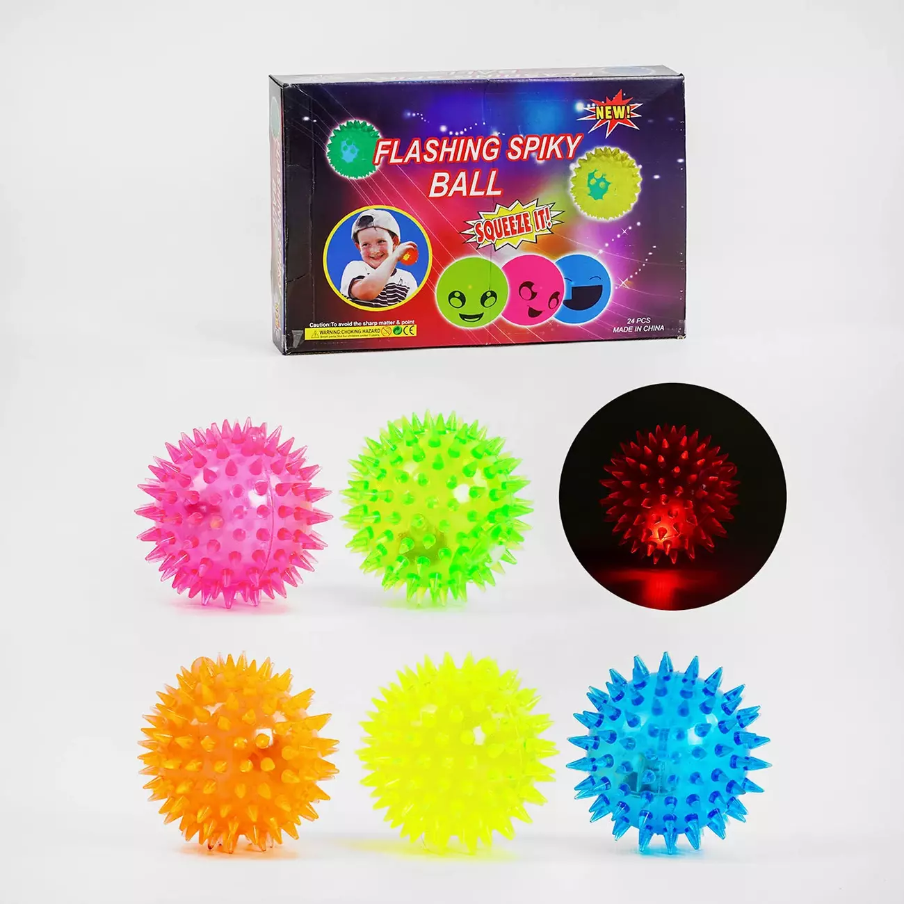 Блоковий набір антистрес-м'ячиків “Flashing Spiky Ball” з пискавкою та світловими ефектами миттєво приверне увагу дитини та внесе яскраву різноманітність у дитячі ігри малюка. М'ячик виготовлений з високоякісної гуми та по всьому корпусу покритий дрібними шипами з м'якими заокругленнями, які не травмують навіть найчутливішу дитячу шкіру. Особливості: - голкова поверхня має масажний ефект і активно стимулює нервові закінчення, а також значно покращує кровообіг; - ефектне різнокольорове підсвічування; - дзвінка пискавка; - м'ячики виконані з м'якої еластичної гуми, яка чудово відновлює свою первісну форму; - у блоковий набір входить 24 м'ячики, 4х кольорів.