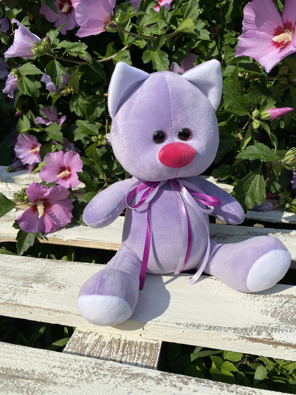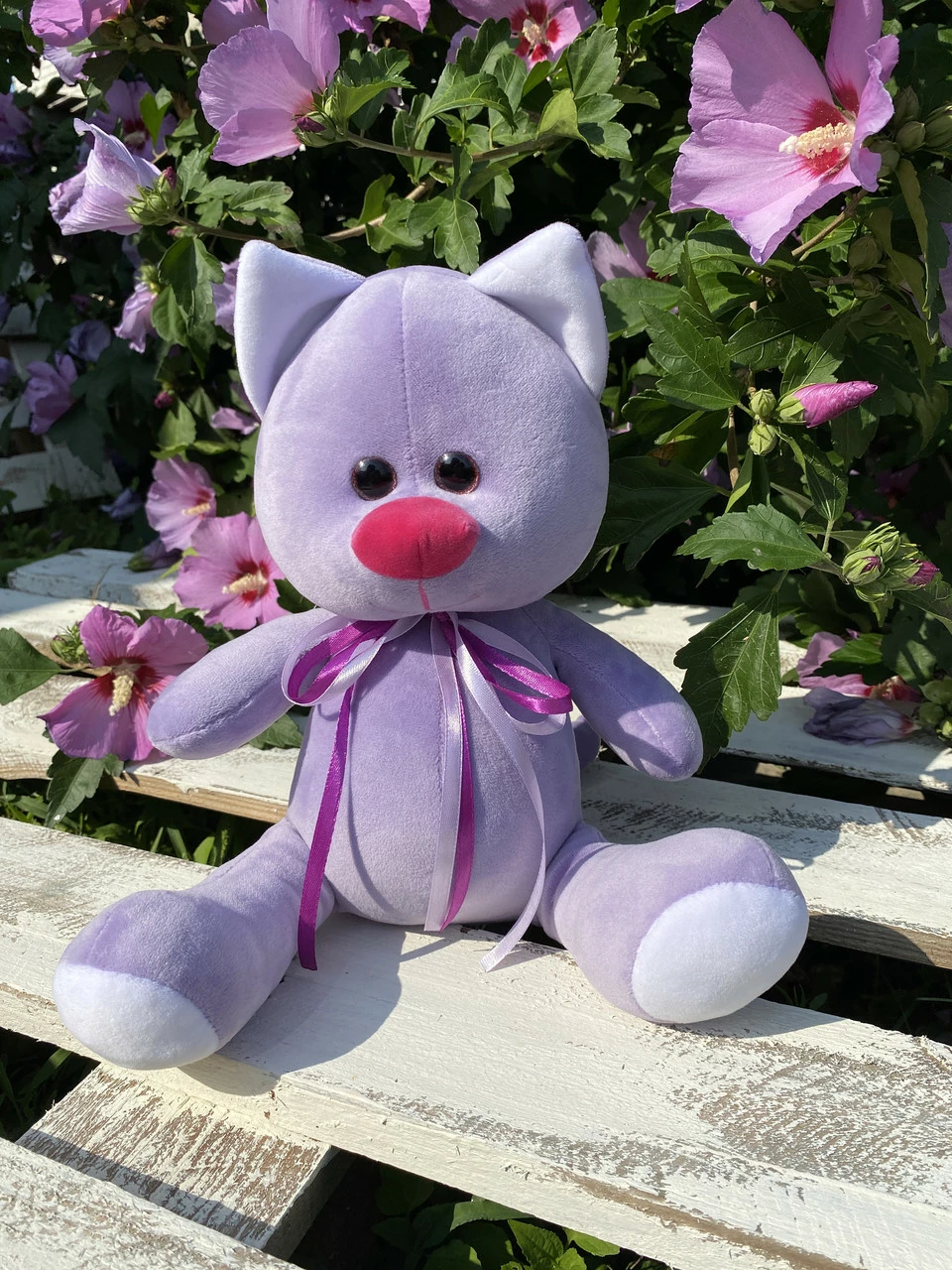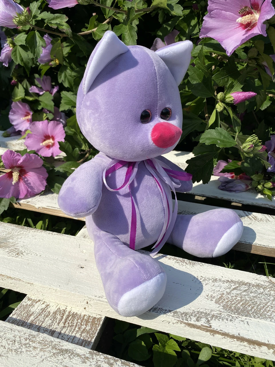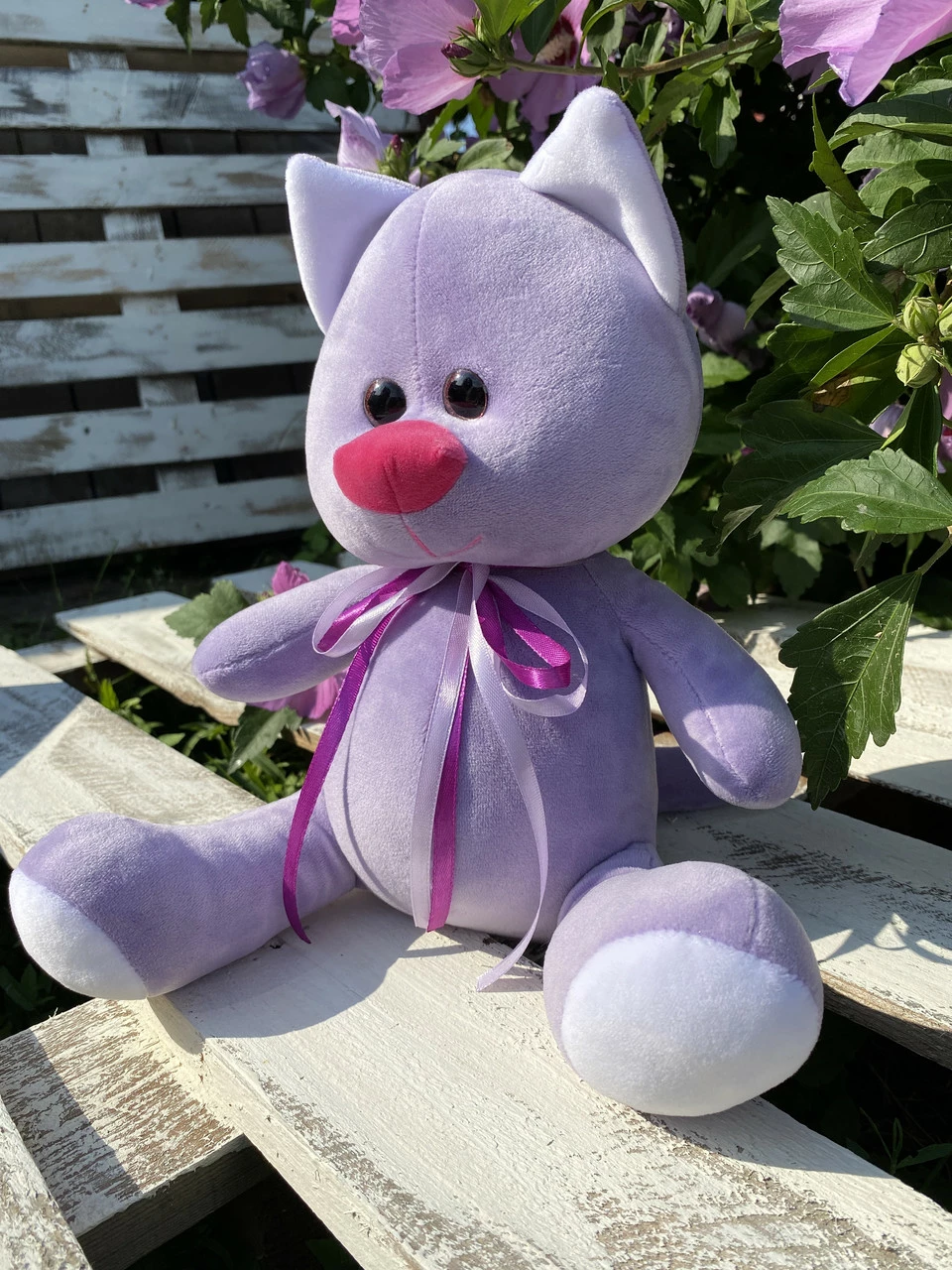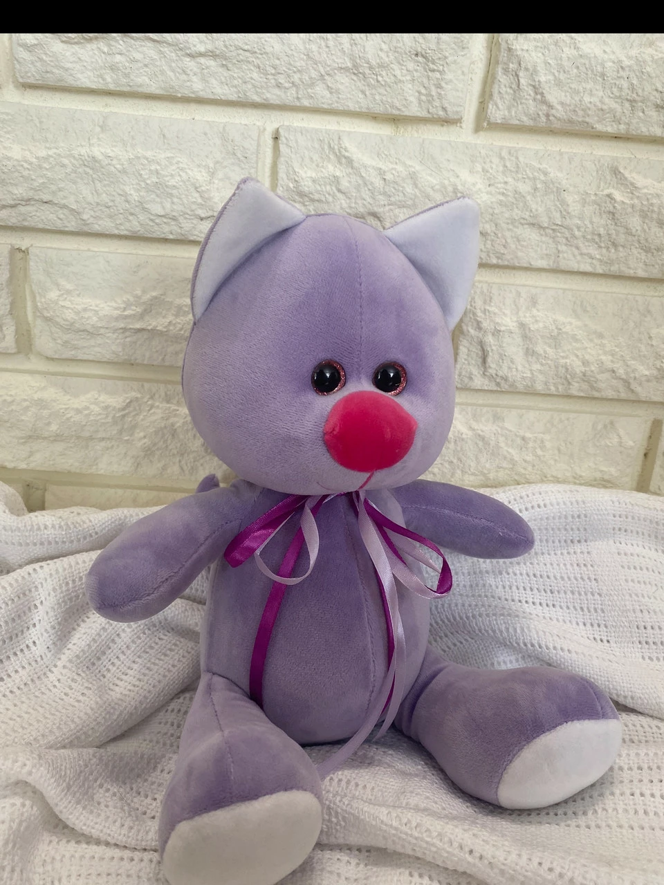Игрушка изготовлена из качественных материалов, мягкая и приятная на ощупь. Лавандового цвета. Размер 33 см.