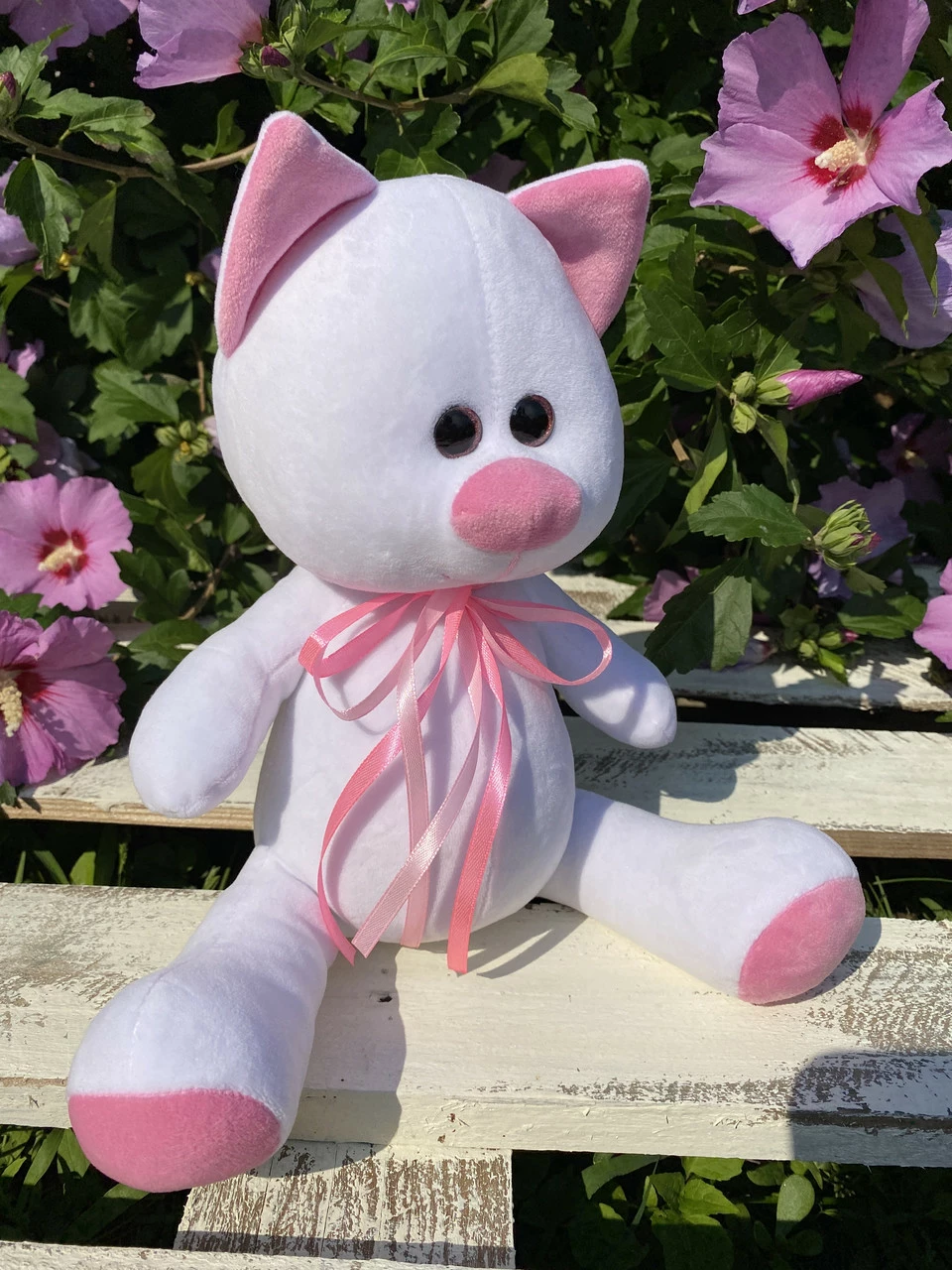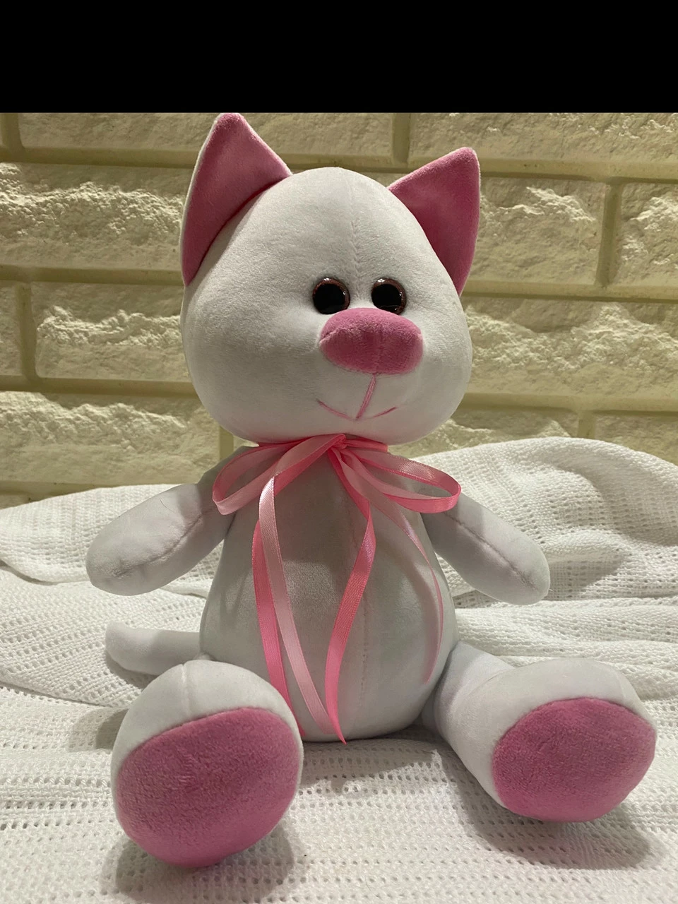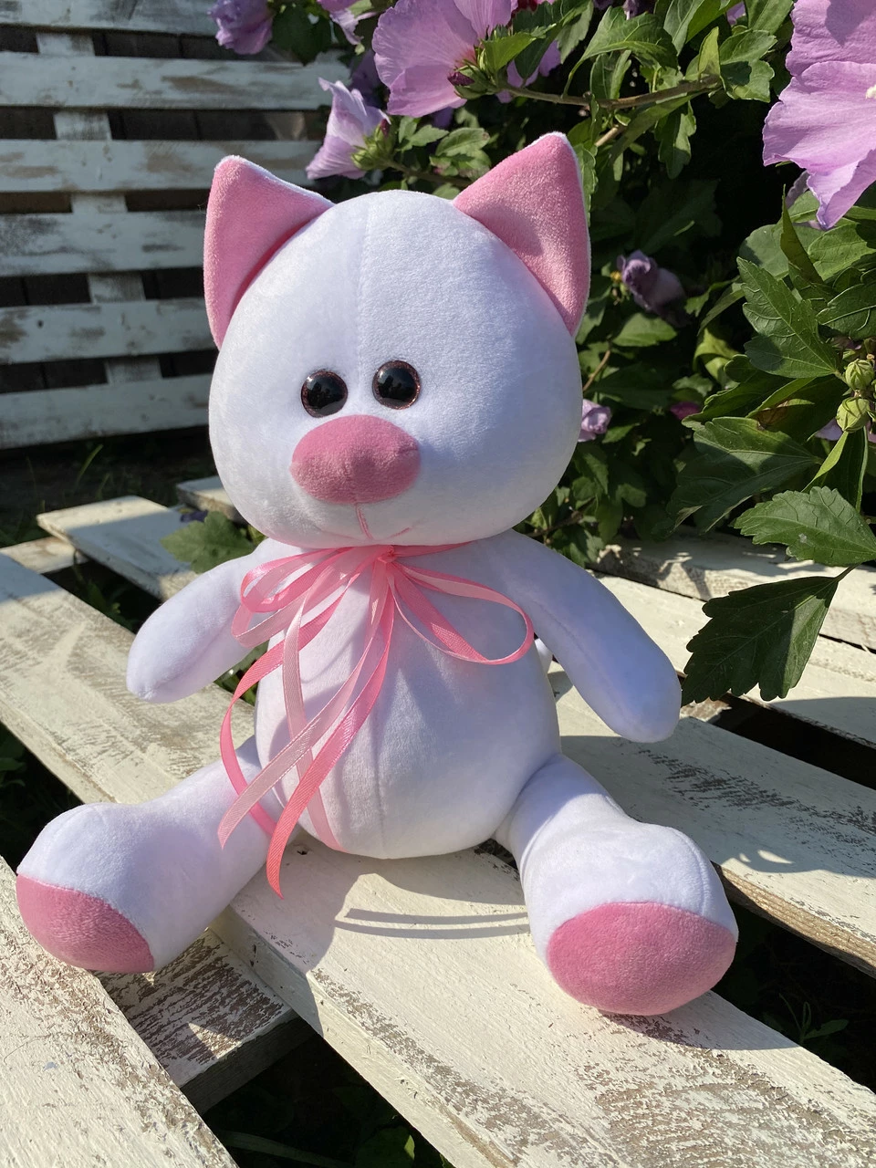 Игрушка изготовлена из качественных материалов ,мягкая и приятная на ощупь. Белого цвета. Размер 33 см.