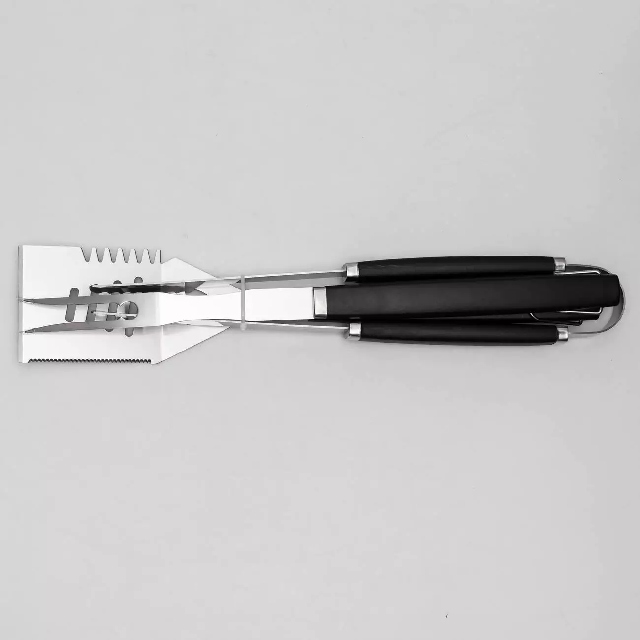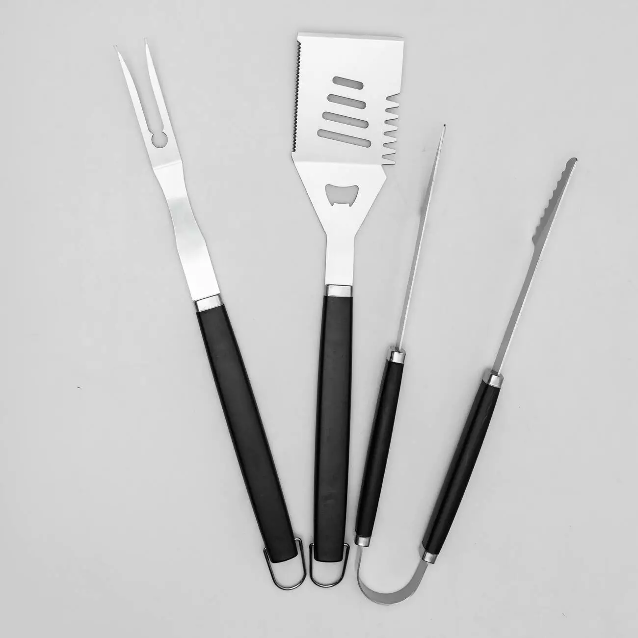 Всі елементи виготовлені з нержавіючої сталі, що забезпечує стійкість до високих температур, вологи та корозії. Інструменти мають продуману форму для зручного хвату та ефективної роботи з різними продуктами — м’ясом, рибою або овочами. Конструкція передбачає отвори або кільця для підвішування, що спрощує зберігання.