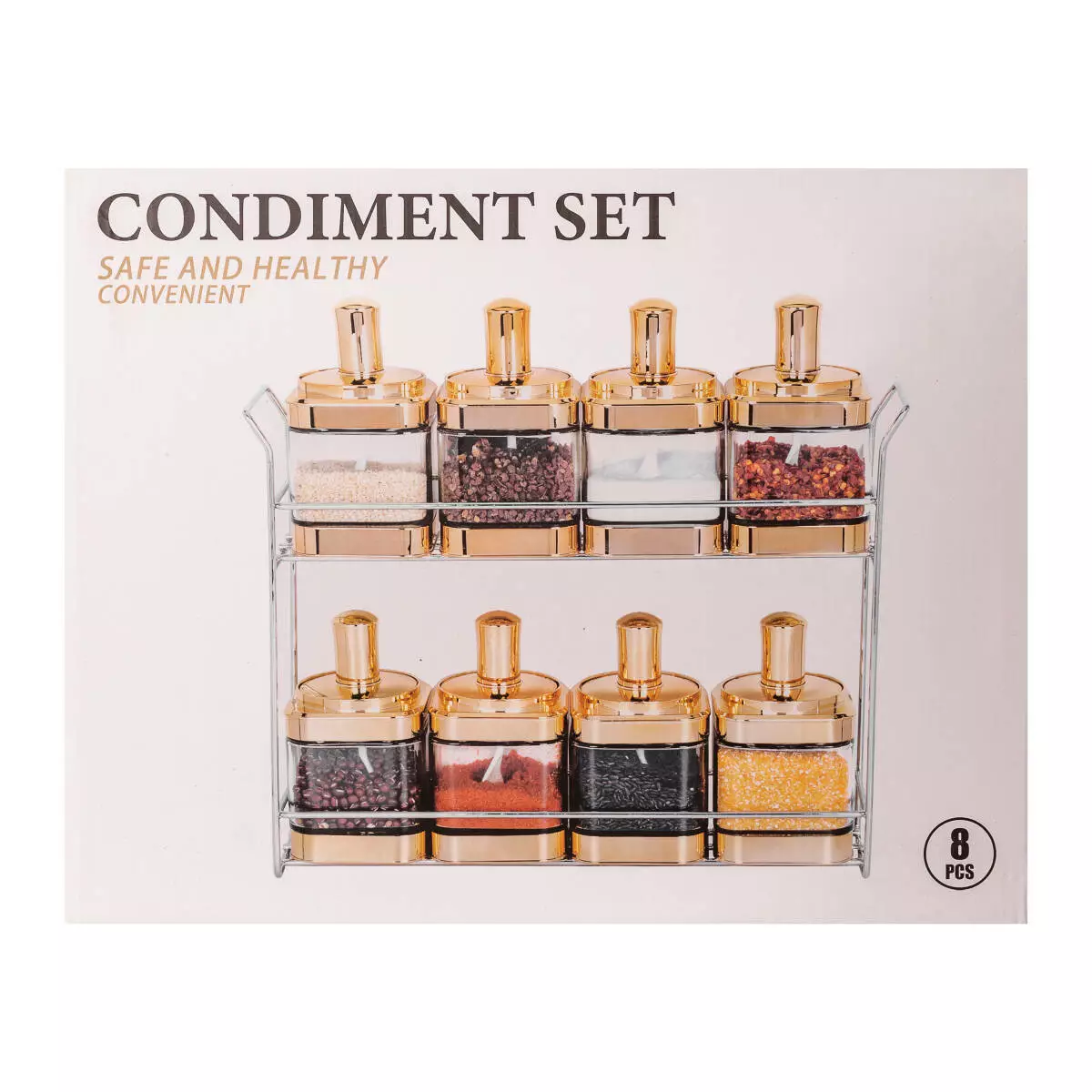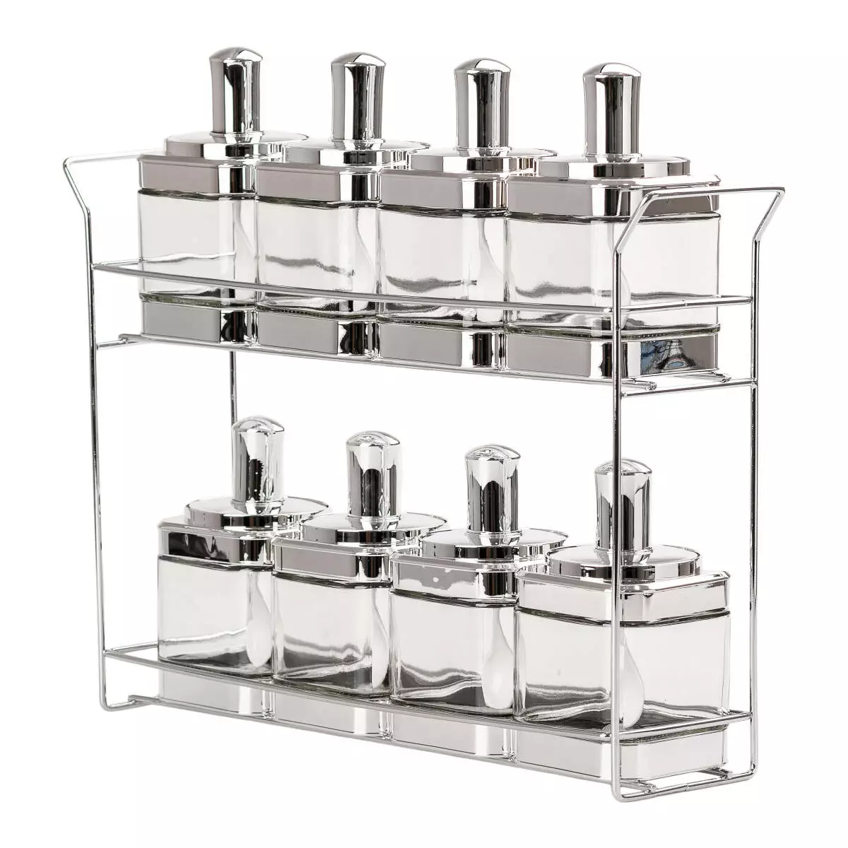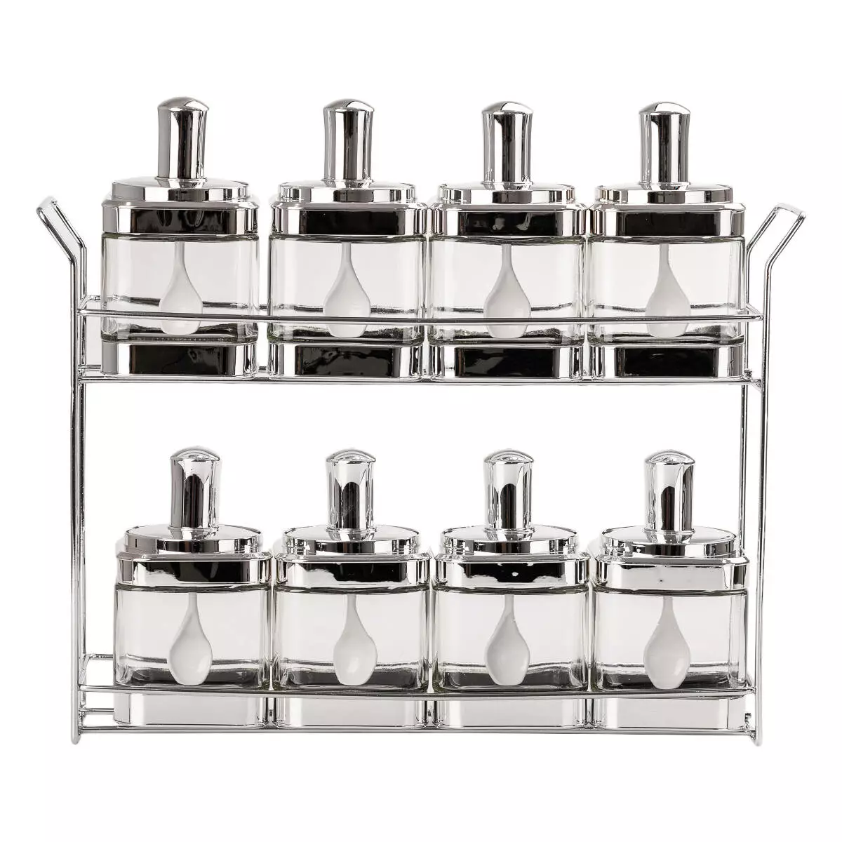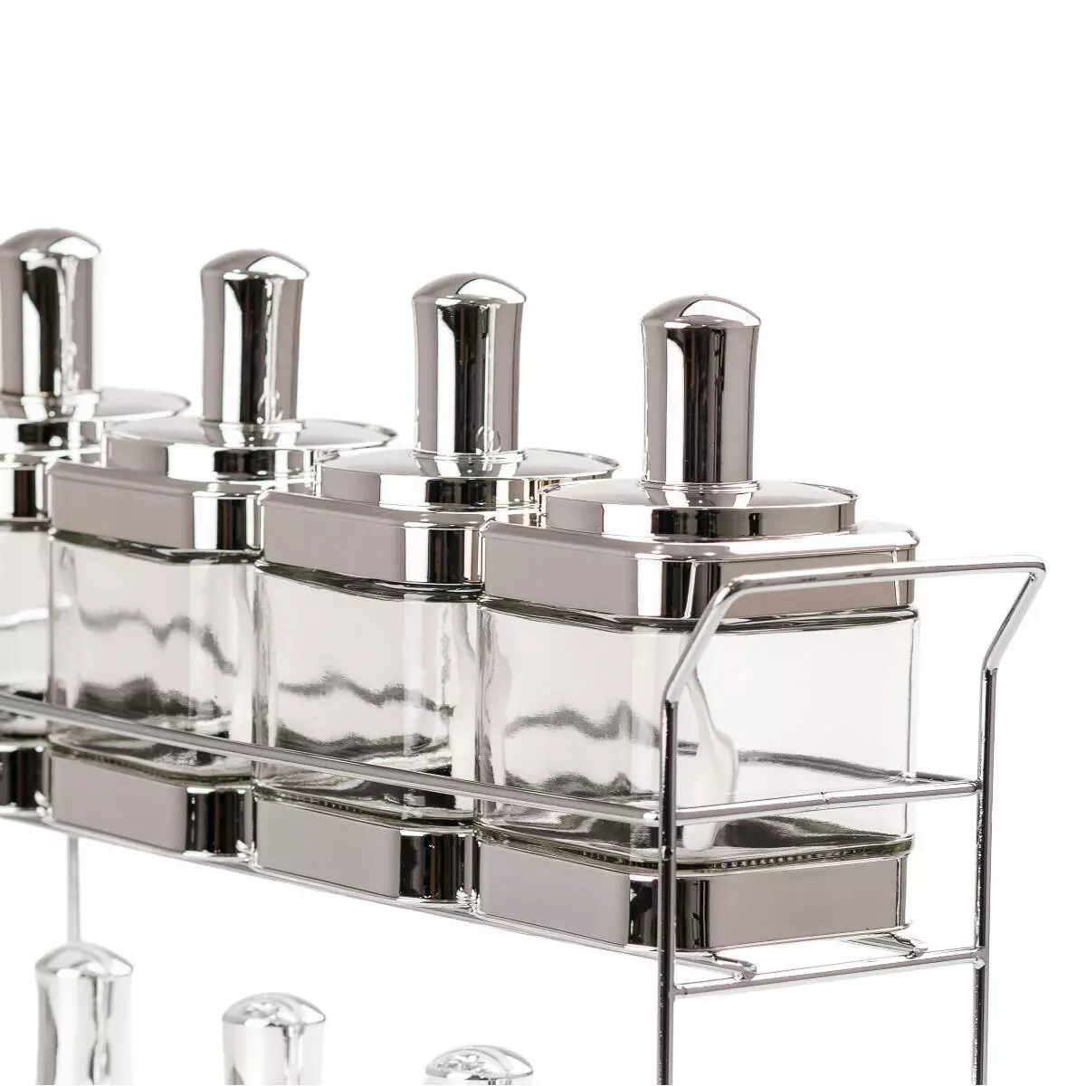 У набір входить підставка з нержавіючої сталі на два яруси для зручної організації зберігання та використання ємностей.
