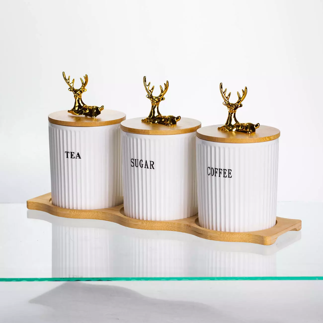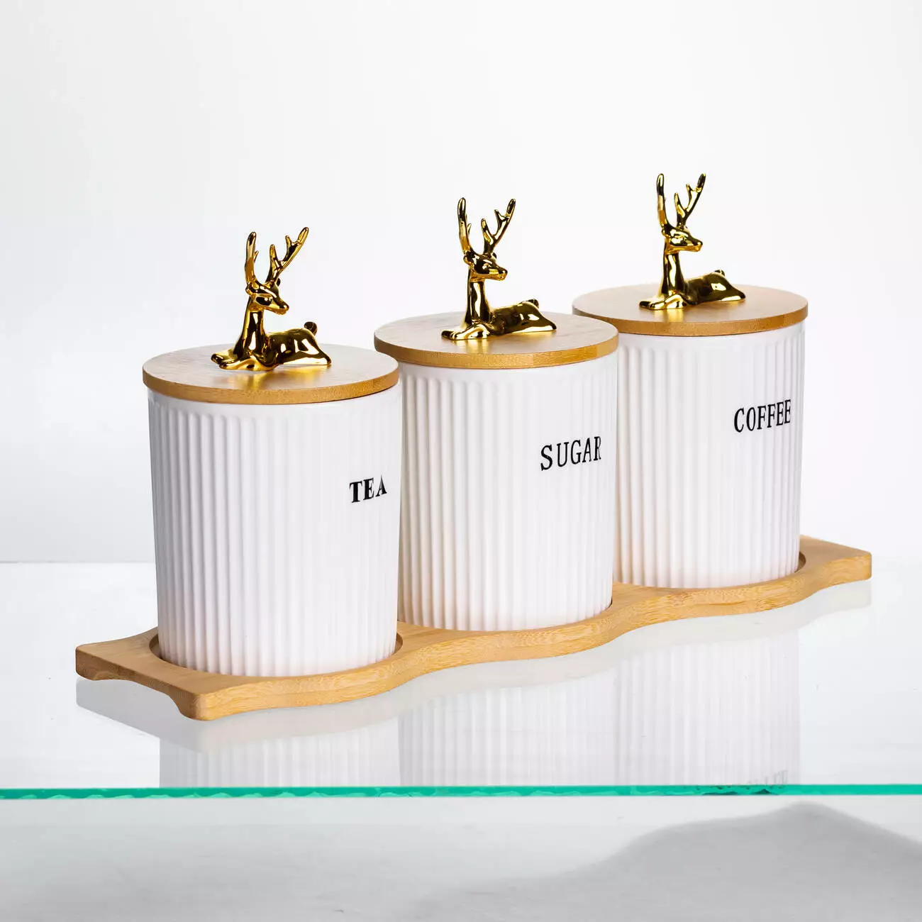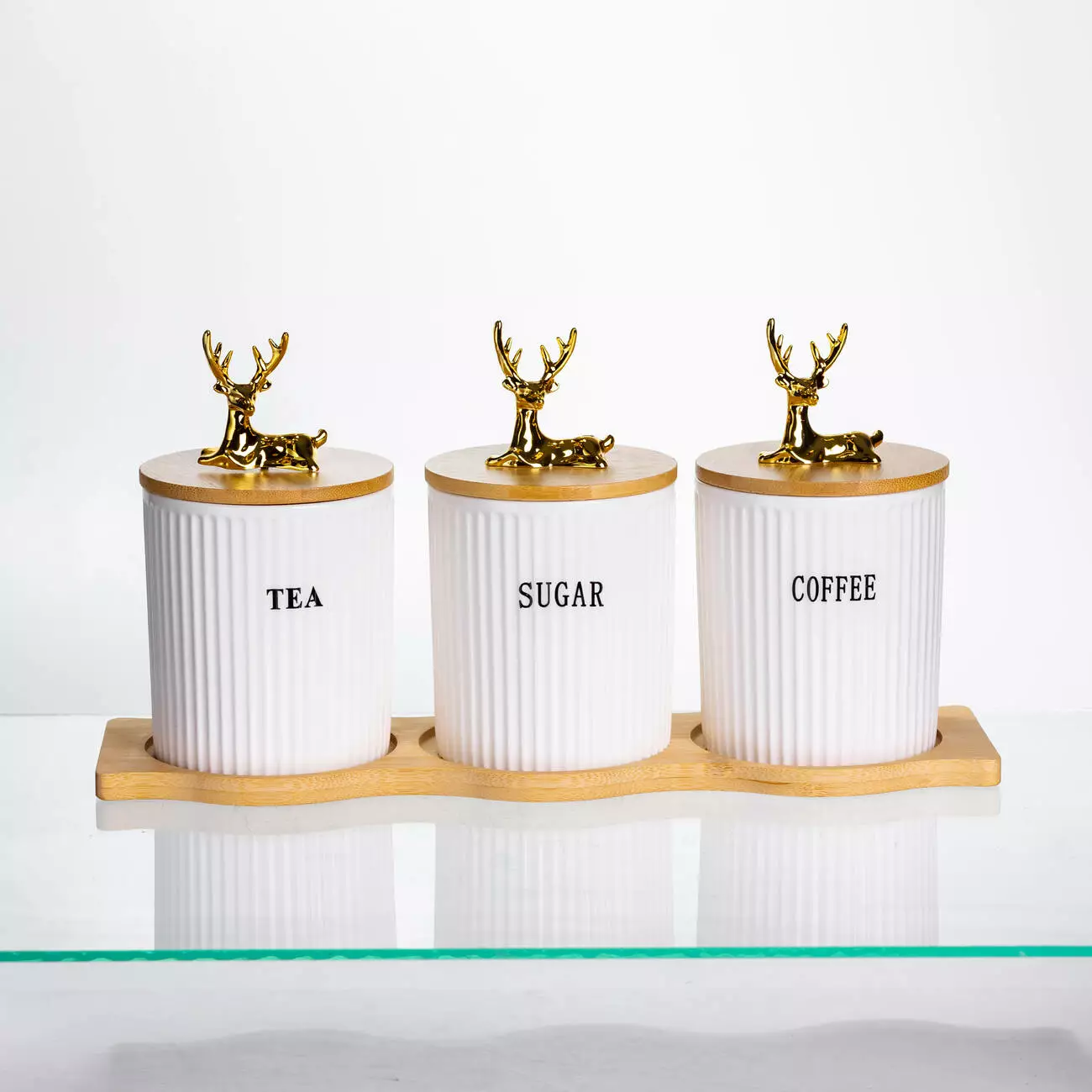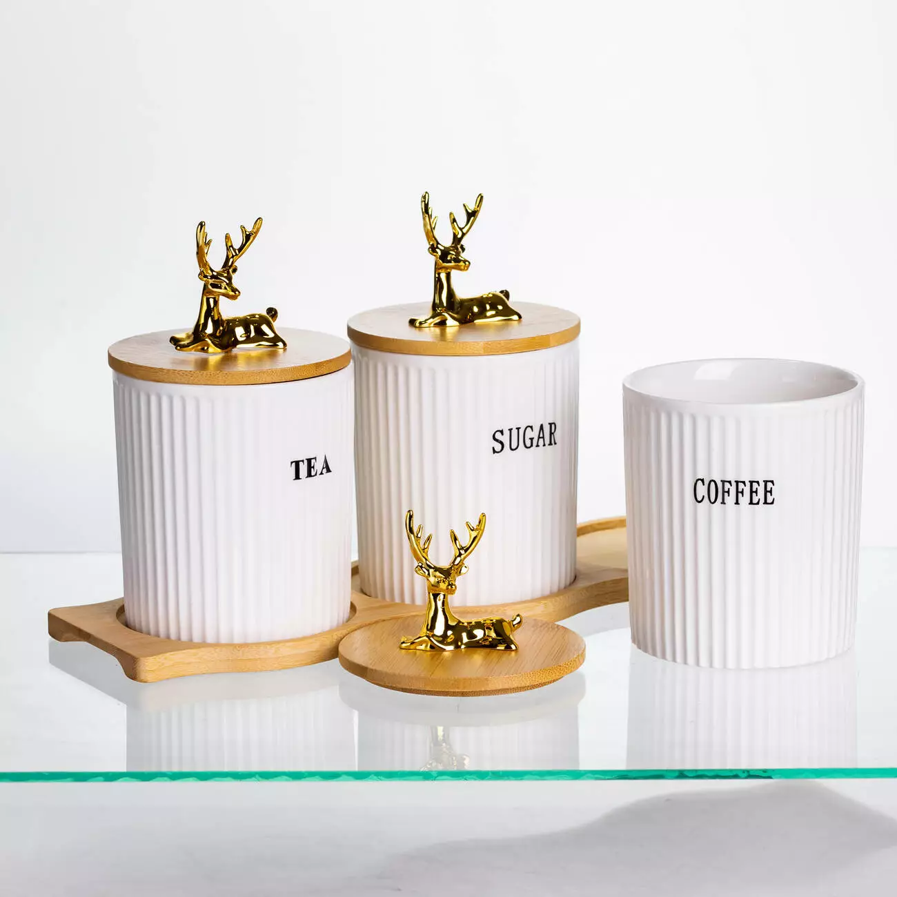 Кришки виготовлені з бамбука, доповнені декоративними фігурками у вигляді золотих оленів. Вони щільно прилягають до банок, захищаючи вміст від вологи та сторонніх запахів. Об’єм кожної ємності — 400 мл, що оптимально підходить для щоденного використання. Завдяки висоті 10 см і діаметру 9 см банки легко розміщуються на полицях або в шафі.