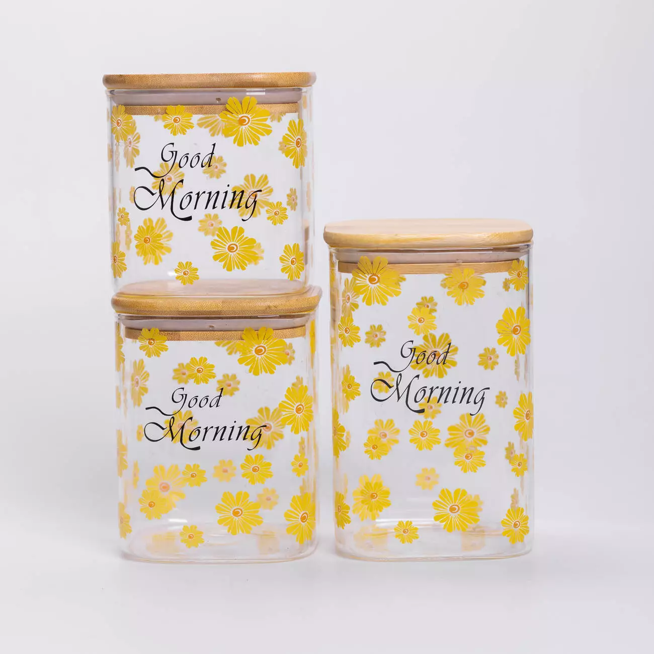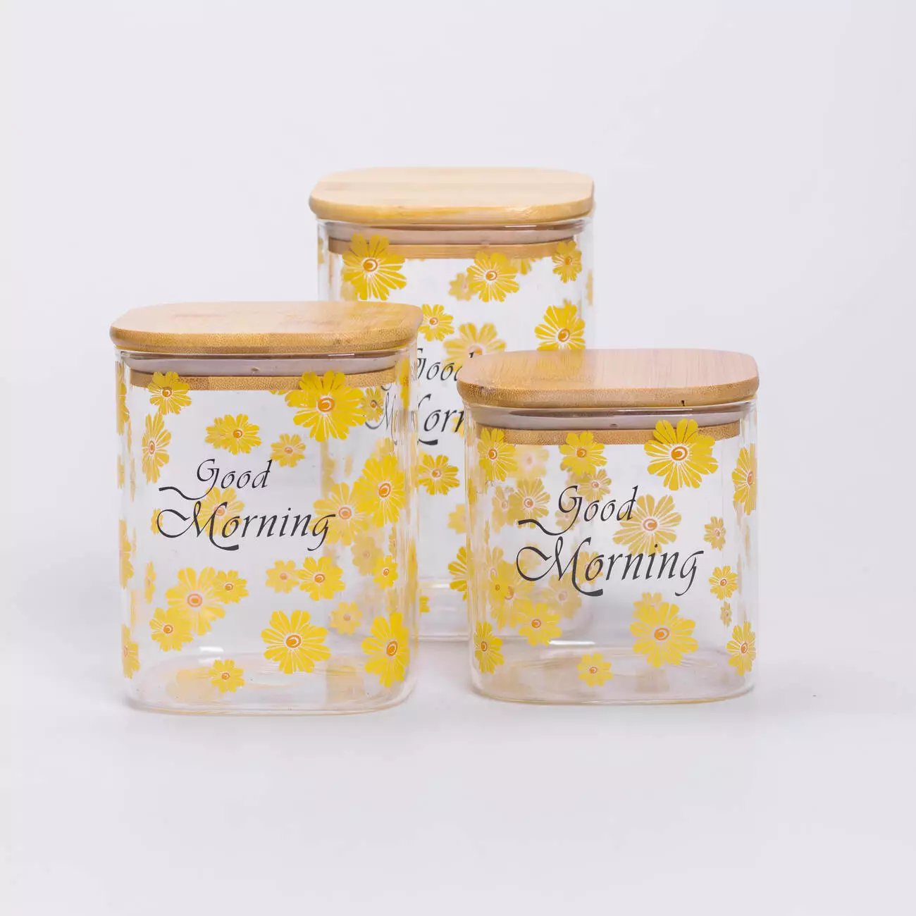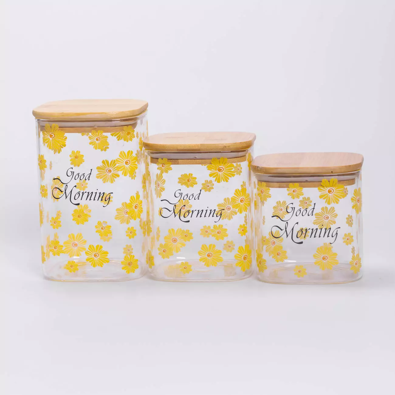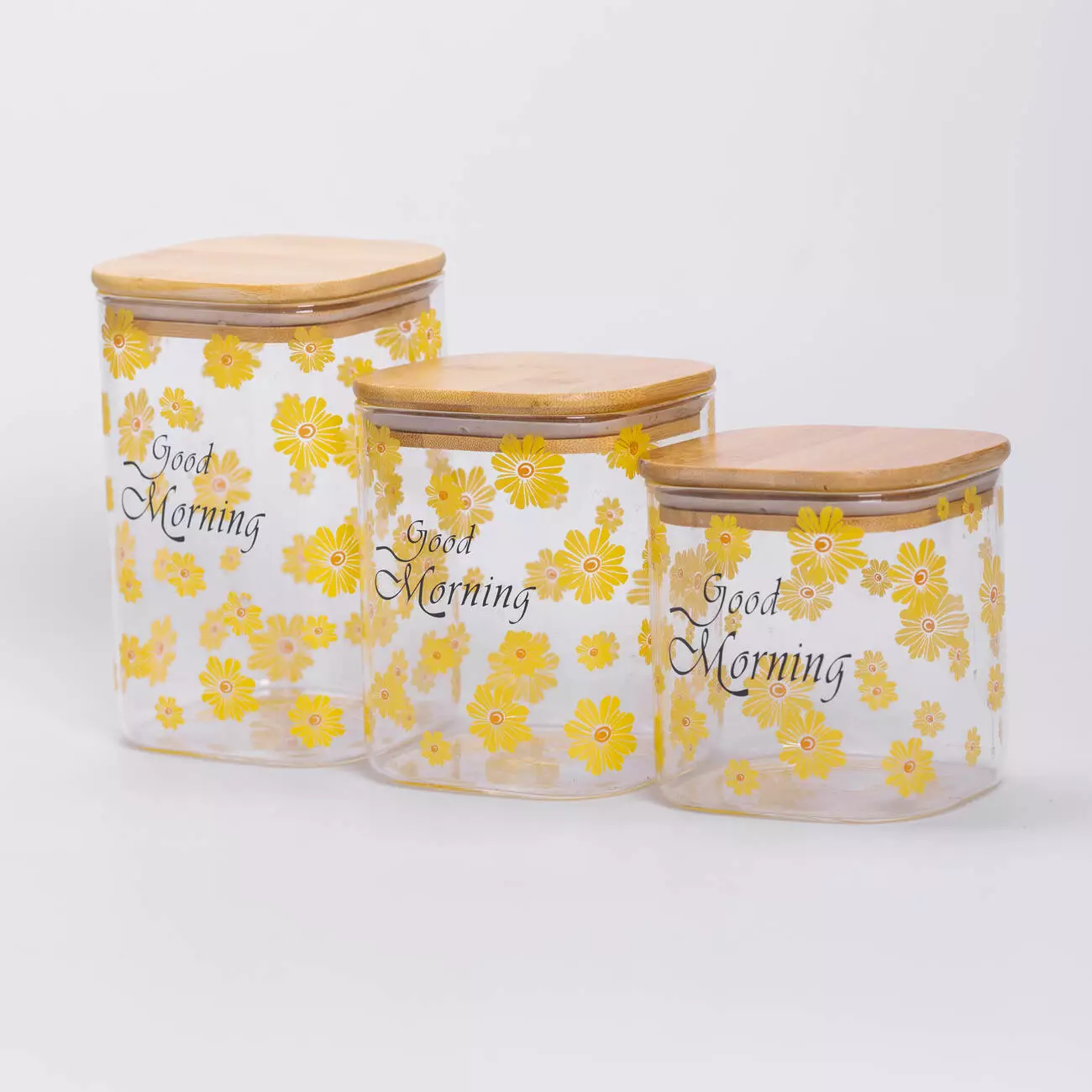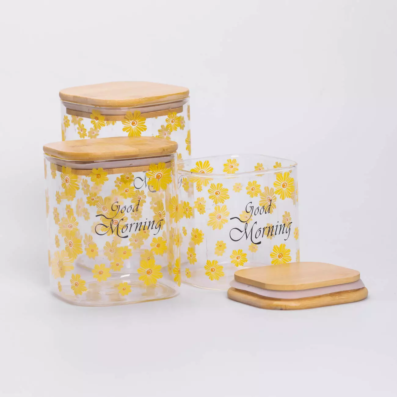Кришки виготовлені з бамбука та оснащені силіконовим ущільнювачем, що забезпечує герметичність і зберігає продукти свіжими тривалий час. Дизайн банок прикрашений яскравими жовтими квітами та надписом Good Morning, що додає кухні приємної атмосфери та створює затишний настрій.