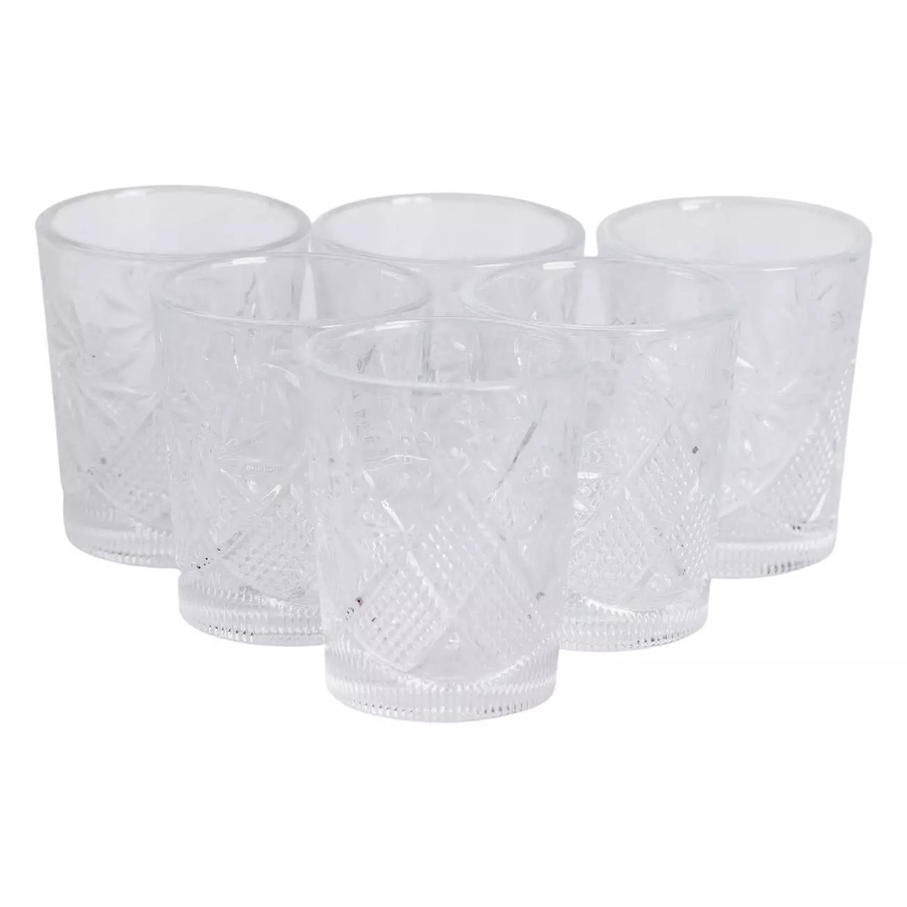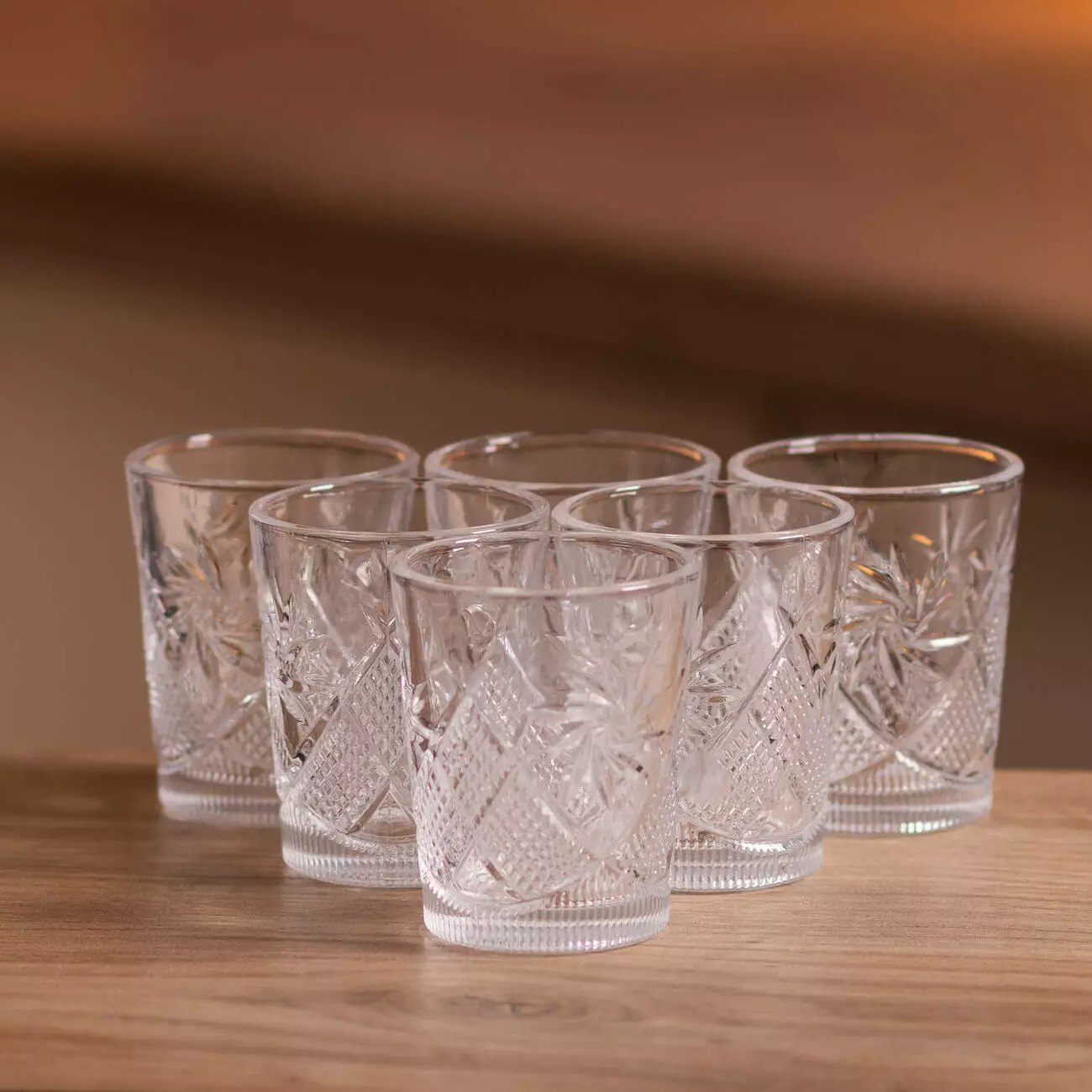 Дизайн поєднує гладке скло з фактурним візерунком, що додає виробам візуальної виразності та приємного тактильного відчуття. Чарки добре тримаються в руці завдяки потовщеному дну та збалансованій формі, що зменшує ризик перекидання.