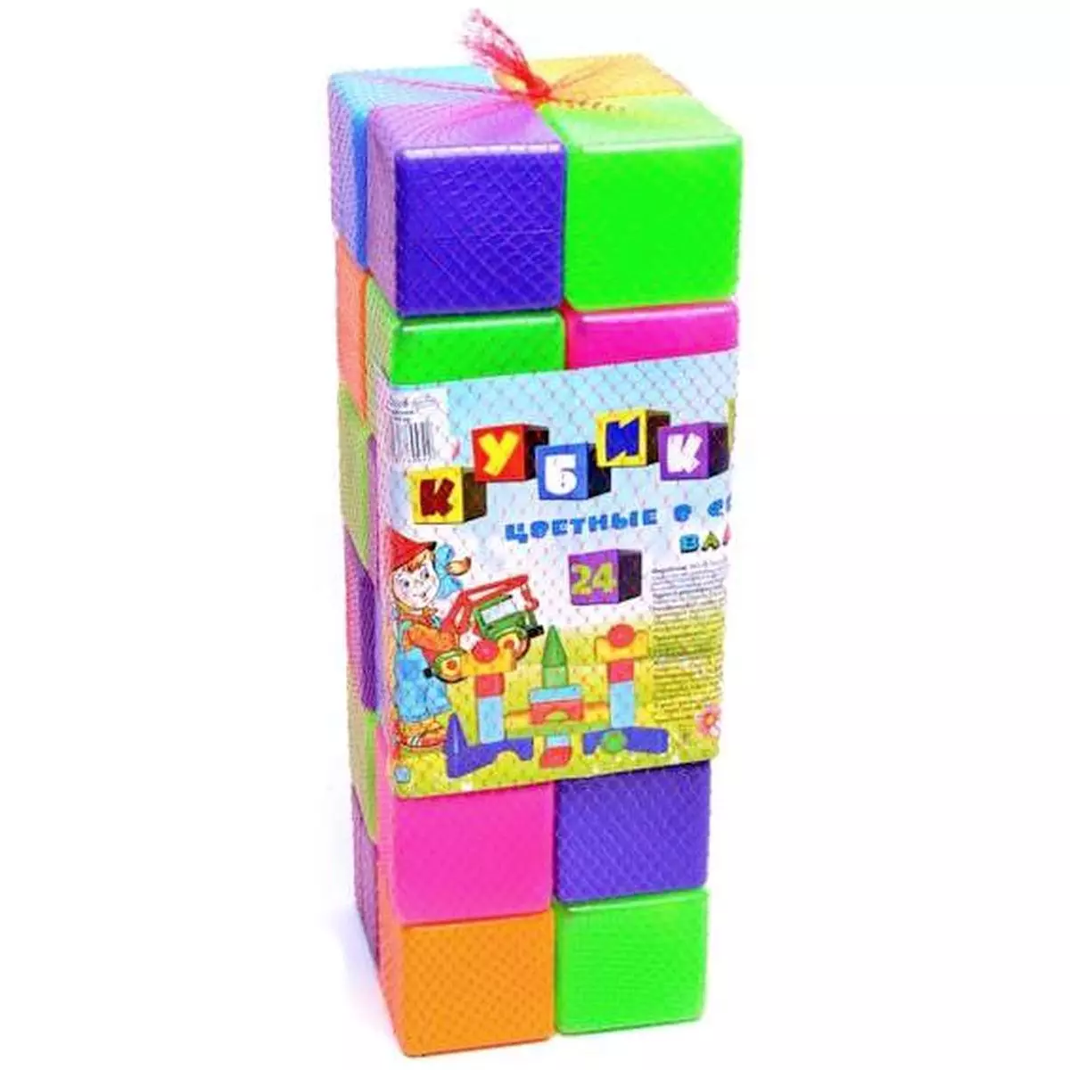 Набір кольорових кубиків у сітці 24 штуки. Розмір кубика 8*8 см. Розмір упаковки 51*17*17 см. Вага 880 г.