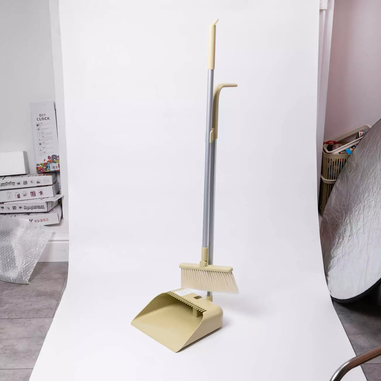 Практичний набір для швидкого прибирання: щітка з довгою ручкою та совок, що складається та фіксується поруч із щіткою. Ідеальний для кухні, передпокою, офісу – зберігається у вертикальному положенні, займає мінімум місця та завжди готовий до використання.