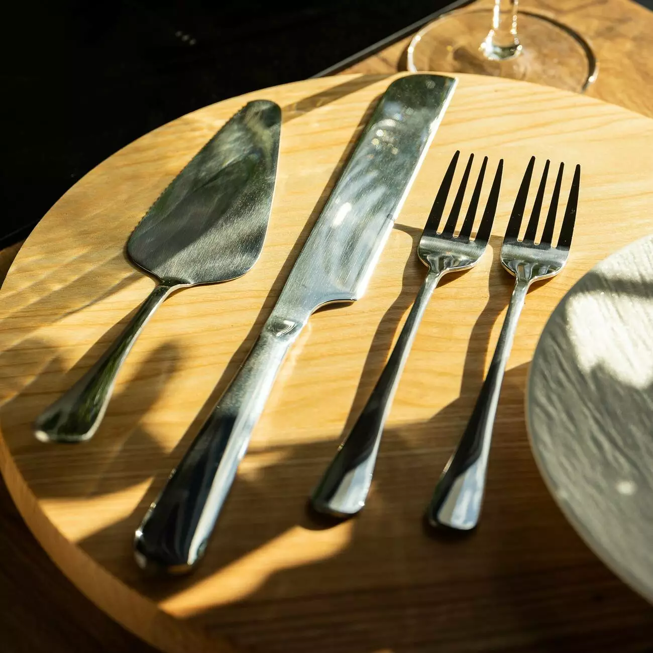 Набір столових приборів для подачі з чотирьох предметів: лопатки, ножа і двох виделок. Усі елементи виготовлені з неіржавкої сталі, що забезпечує їхню довговічність і стійкість до корозії. Гладка поверхня приладів сприяє легкому очищенню і запобігає утворенню плям.