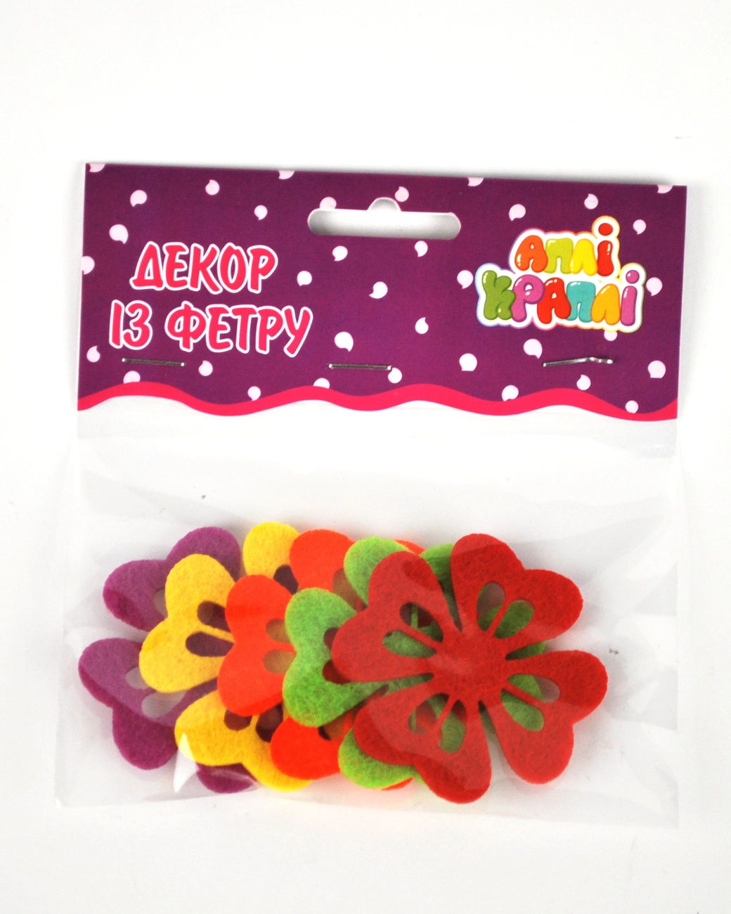 Набір складається з 5-ти м'яких різнокольорових фетрових елементів, які можна використовувати для різних виробів і декорування.