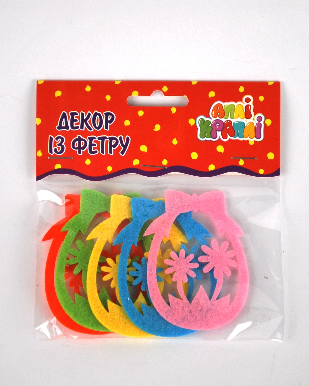 Набір складається з 5-ти м'яких різнокольорових фетрових елементів, які можна використовувати для різних виробів і декорування.
