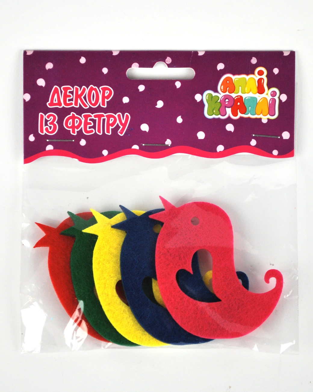 Набір складається з 5-ти м'яких різнокольорових фетрових елементів, які можна використовувати для різних виробів і декорування.