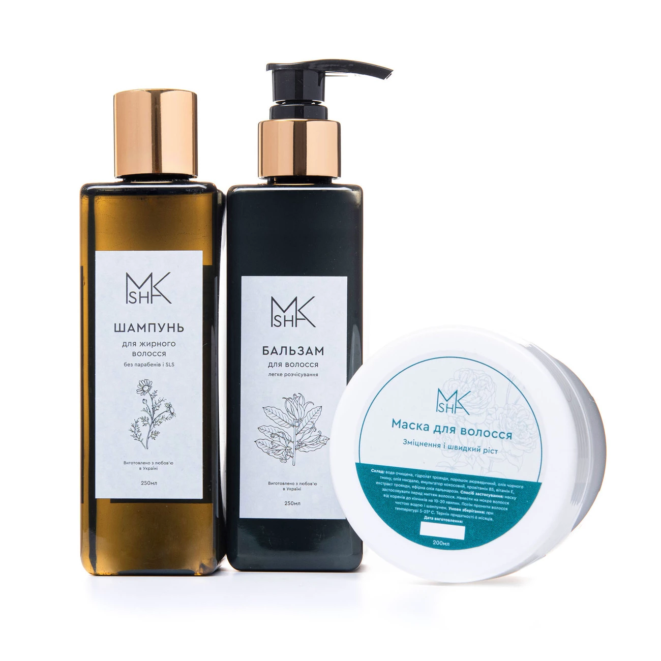Склад набору: шампунь рідкий для жирного волосся, бальзам «Легке розчісування», маска для волосся «Зміцнення і швидкий ріст».