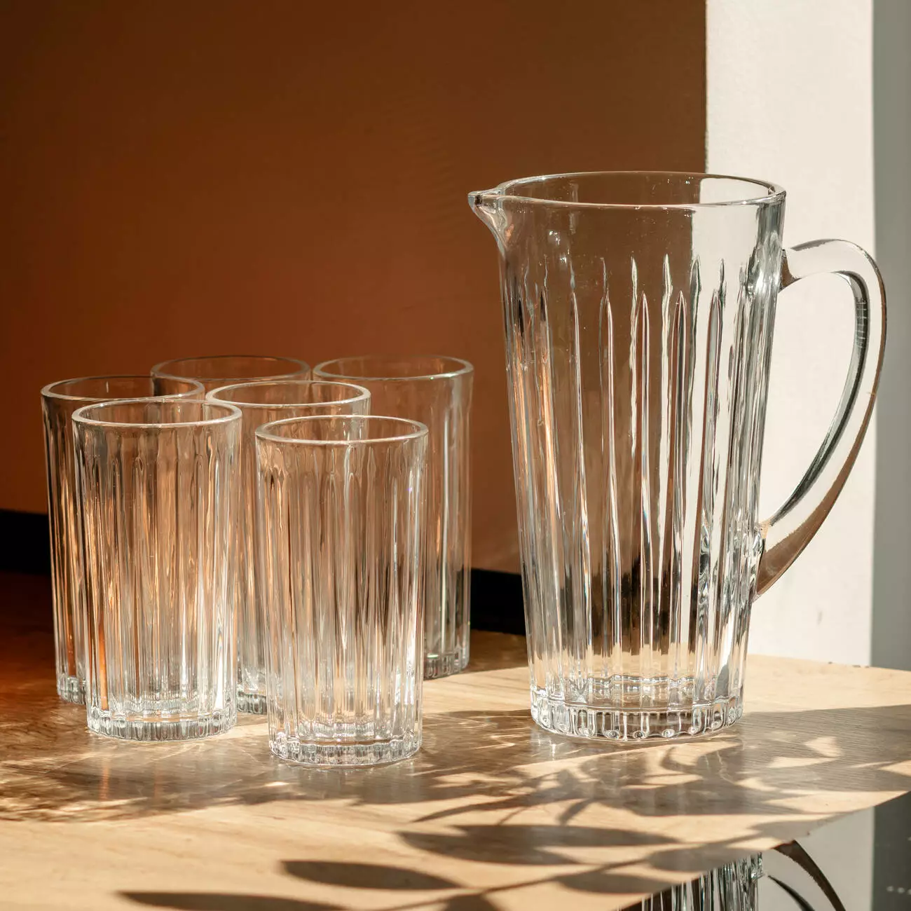 Скляний набір, що складається з глечика об'ємом 1,2 л та шести склянок по 320 мл, призначений для подавання холодних напоїв. Виготовлений із товстого скла, він добре витримує щоденне використання та зберігає охолоджувальний ефект рідини. Глечик має висоту 23 см, верхній діаметр 12 см і нижній — 8,5 см, що забезпечує зручне наливання та стійке розміщення на столі.