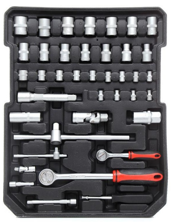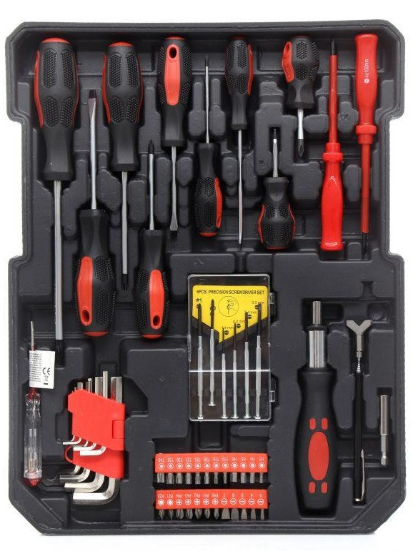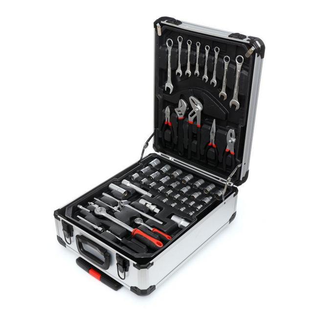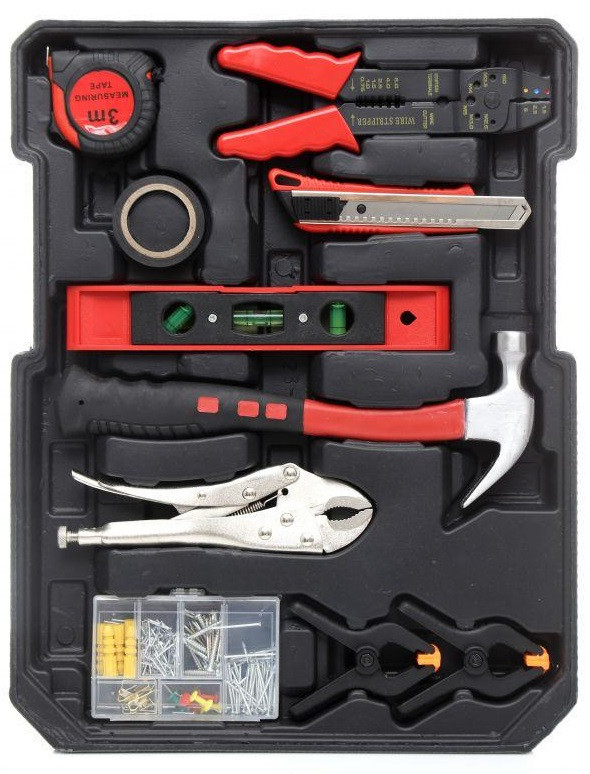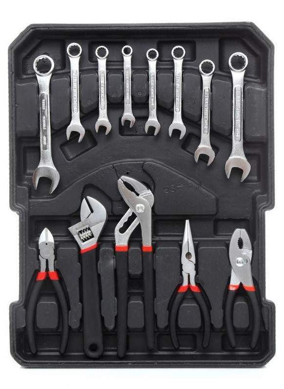 Надійність, надійність і ергономіка. До набору із декількома змінними касетами входять: ключі плоскі, торцеві, тріскачка, молоток, набір пасатижів, ватерпас, струбцини, рулетка вимірювальна, ізострічка, ніж, набір цвяхів і шурупів, а також викрутки та біти. З усіма вашими інструментами в одному місці вам буде потрібно лише кілька хвилин, щоб знайти той, який вам потрібен найбільше. Ми рекомендуємо цей товар усім, хто цінує високу якість і гарну ціну. Незамінний у всіх професійних автомайстернях, ремонтних і виробничих компаніях.