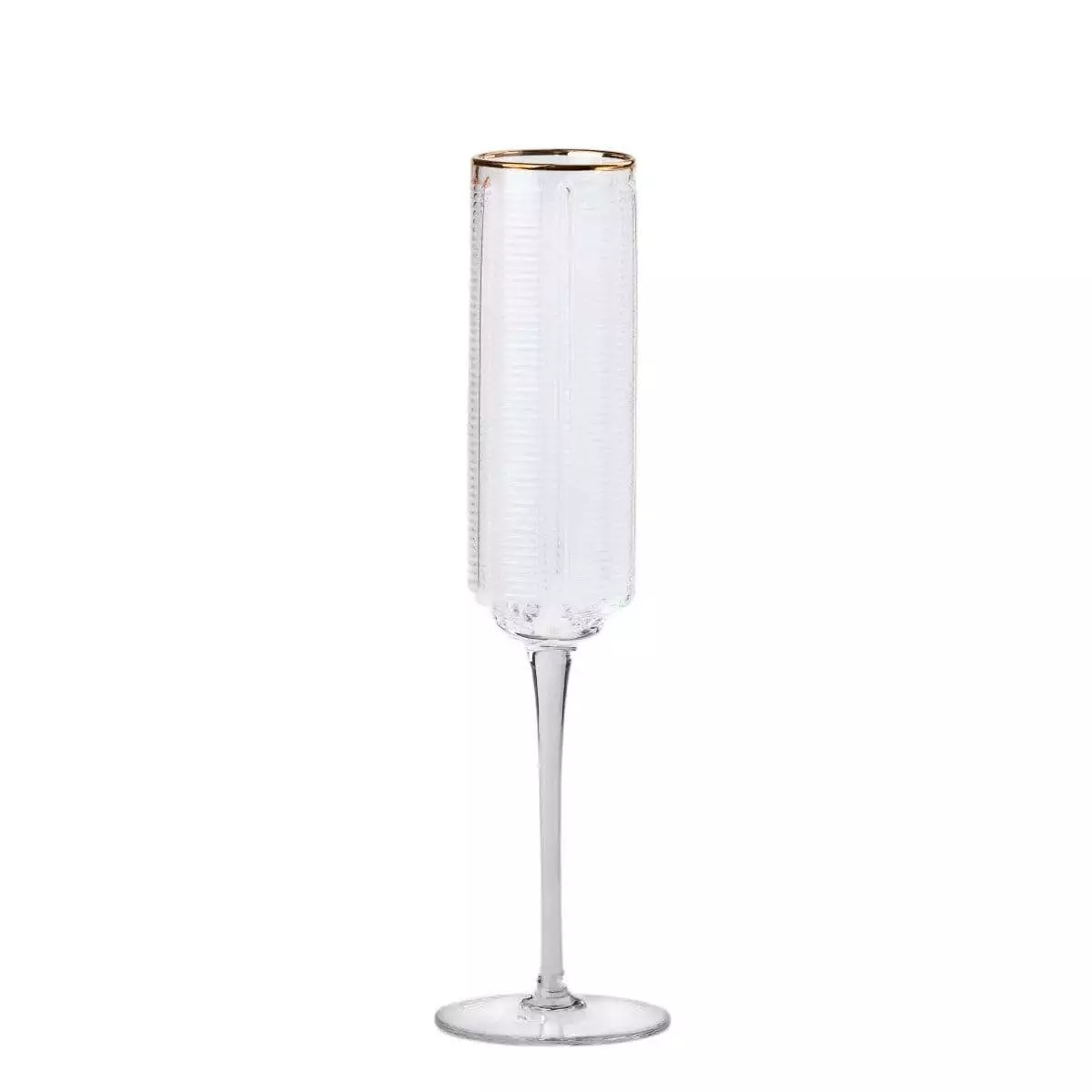 Набір келихів для шампанського Stunning складається з шести елегантних келихів, які привертають увагу своїм витонченим дизайном. Виготовлені з прозорого скла, ці келихи чудово демонструють ігристі властивості шампанського, підкреслюючи його прозорість і ніжний колір. Золотий обідок додає келихам нотку розкоші, створюючи відчуття вишуканості й святковості під час подачі напою.