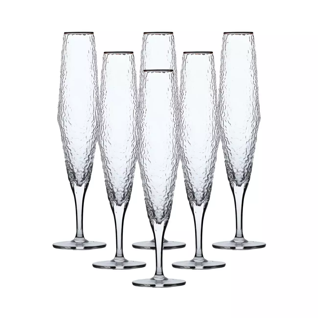 Набір келихів для шампанського Stunning складається з шести витончених фактурних келихів, які привертають увагу своєю елегантністю та сучасним дизайном. Виготовлені з прозорого скла, ці келихи дозволяють повністю оцінити колір та ігристість напою. Фактурна поверхня додає їм унікальності та грайливо відбиває світло, створюючи особливу атмосферу під час святкувань. Золотий обідок надає келихам нотку розкоші та завершеності.