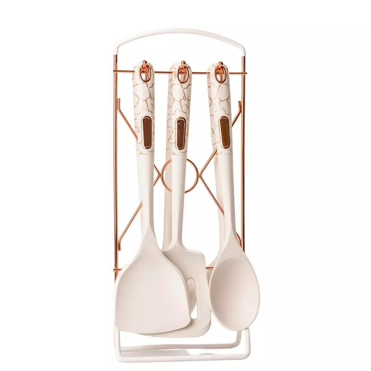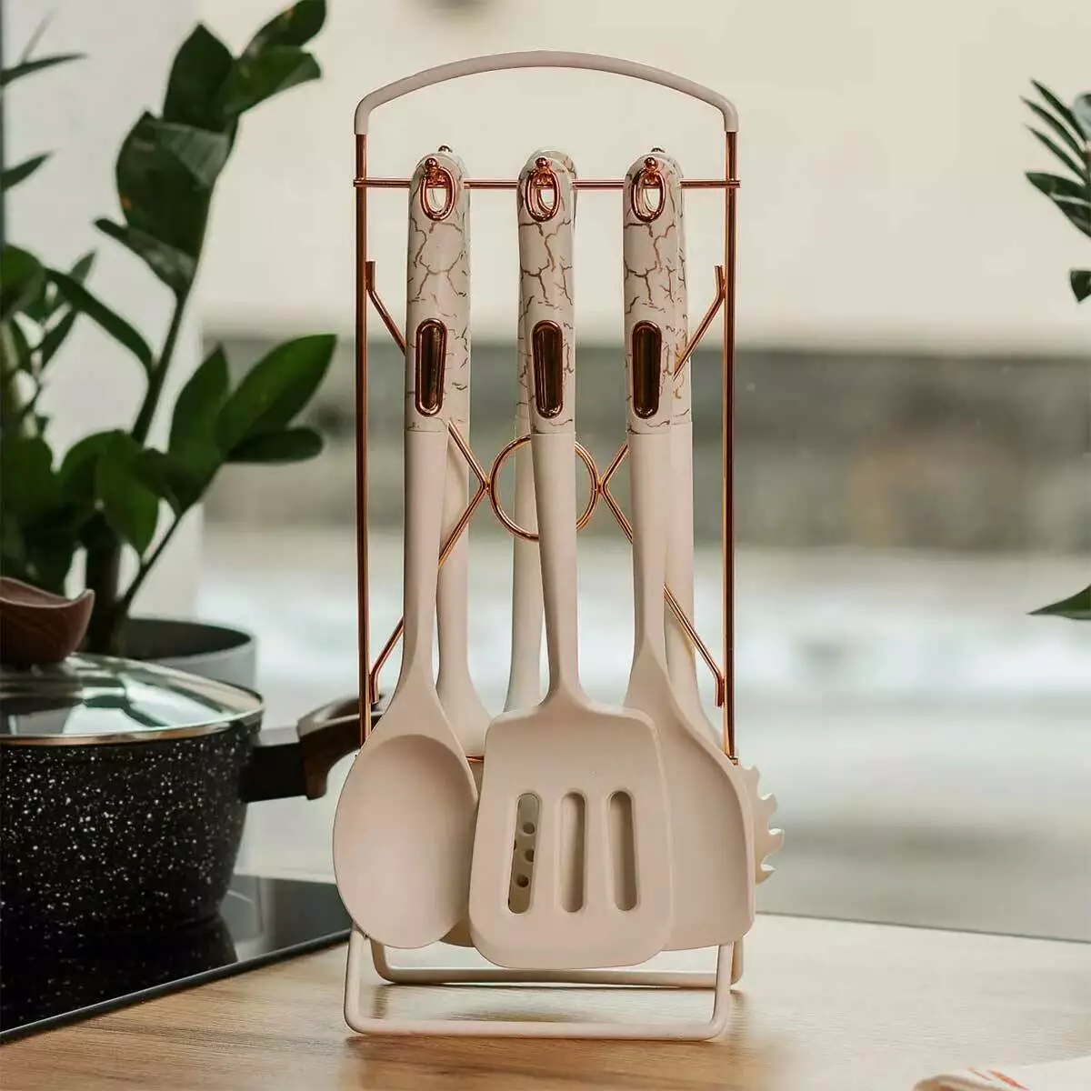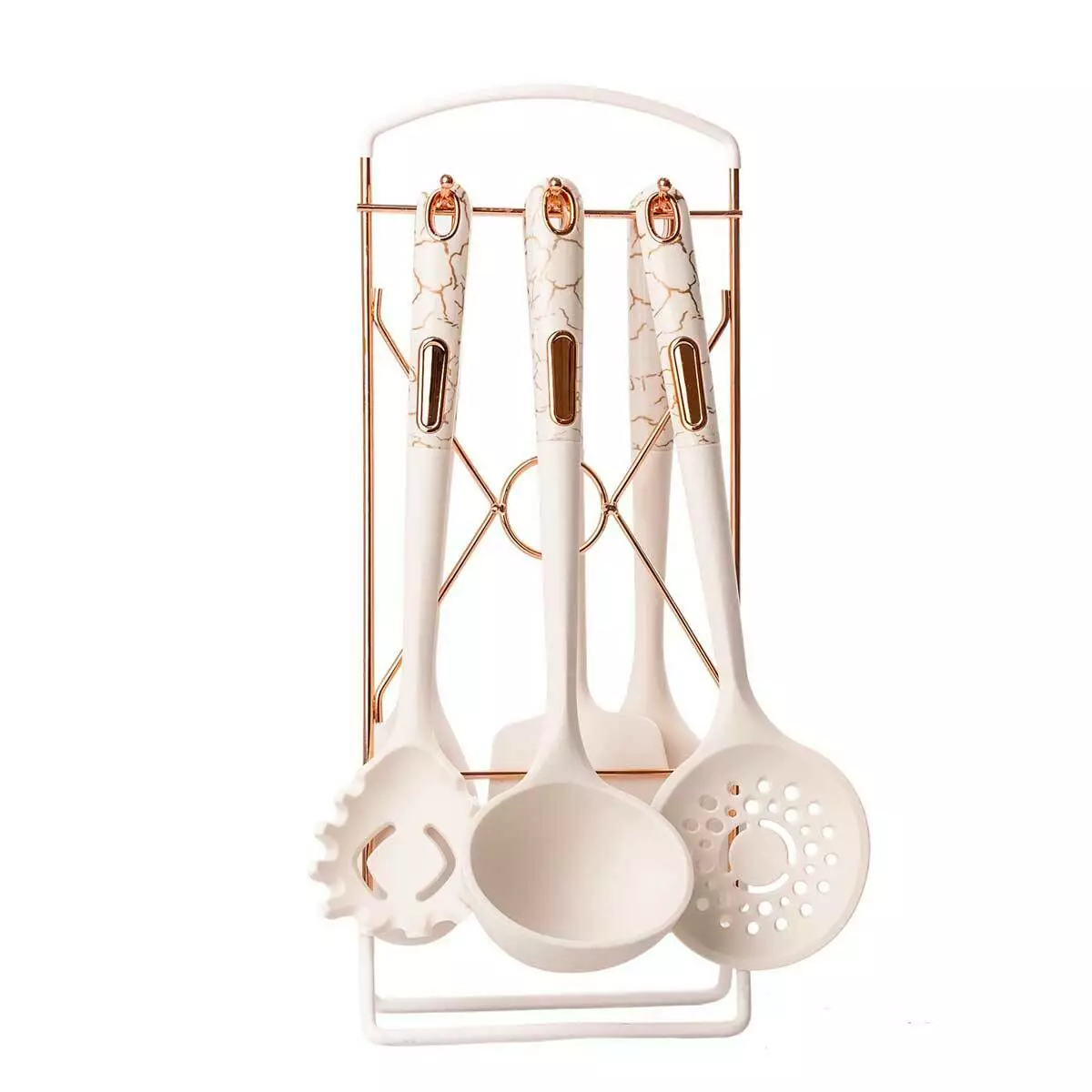 Набір кухонного приладдя на підставці включає 6 стильних кухонних аксесуарів у мармуровому дизайні. До нього входять ополоник, кухонні лопатки, кухарську ложку, шумівку, ложку для спагетті. Набір має елегантний дизайн і приємний на дотик. Він стане чудовим доповненням до будь-якої кухні.