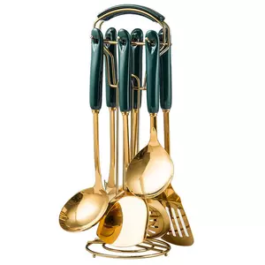 Набір кухонного приладдя складається з 6 предметів, виготовлених із нержавіючої сталі із золотою основою. Кожен елемент оснащений керамічними ручками, які забезпечують зручне використання та додають естетичності. Прилади розміщуються на металевій підставці, що сприяє компактному зберіганню та організації простору на кухні.