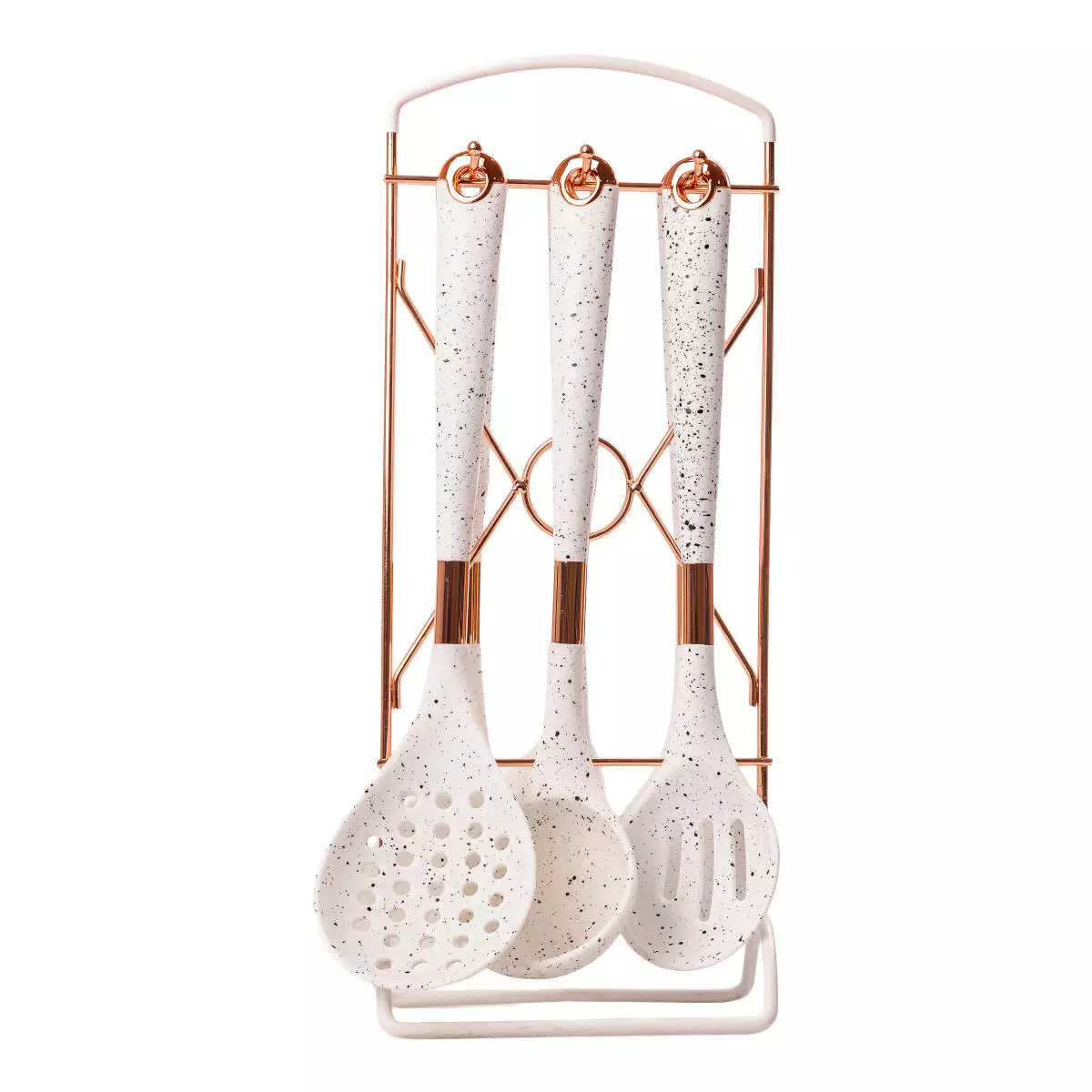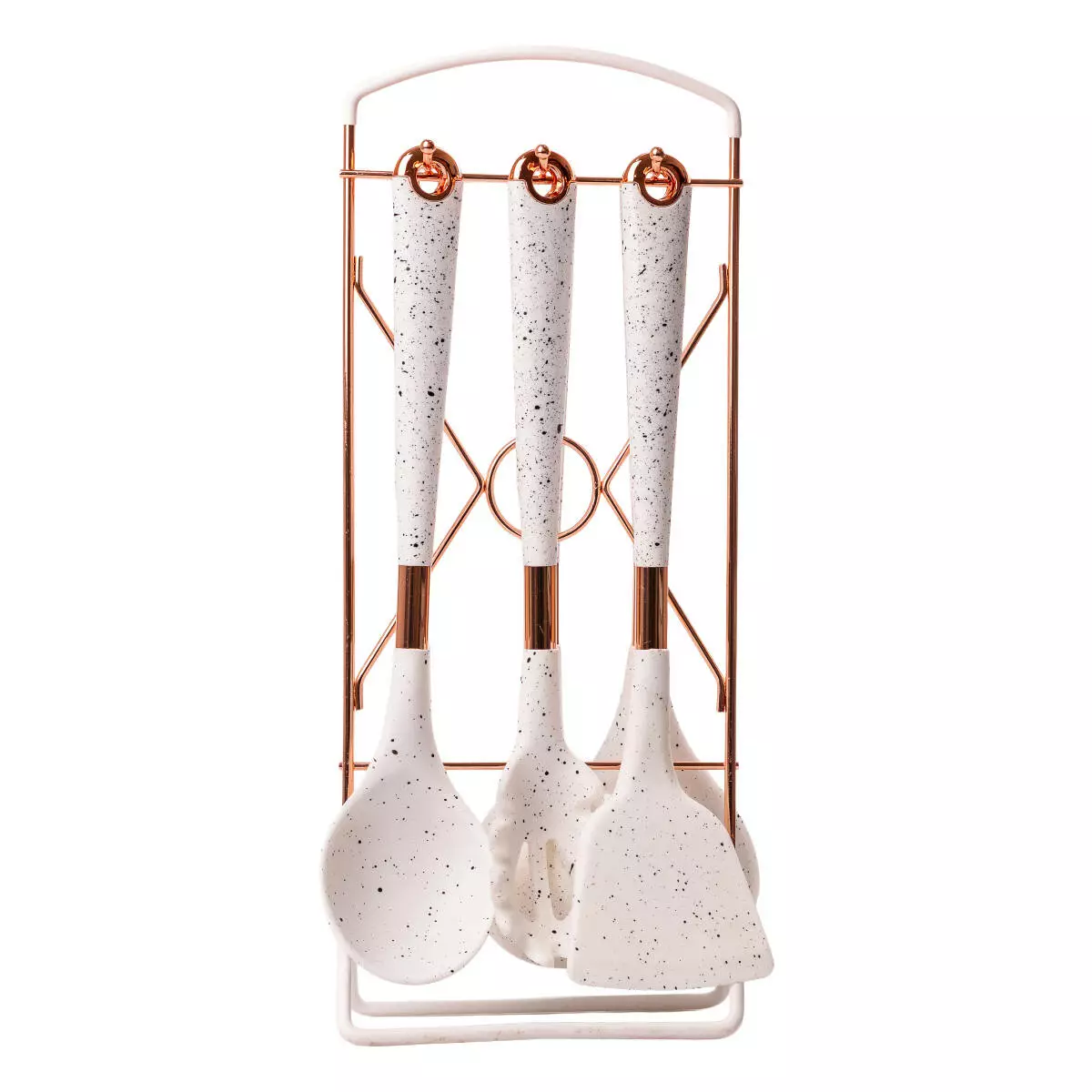 Набір кухонного приладдя на підставці включає 6 стильних кухонних аксесуарів у мармуровому дизайні. До нього входять кухарську ложку, шумівку, ложку для спагетті, кухонну лопатку, ложку для салату. Набір має елегантний дизайн та приємний на дотик. Він стане чудовим доповненням до будь-якої кухні.