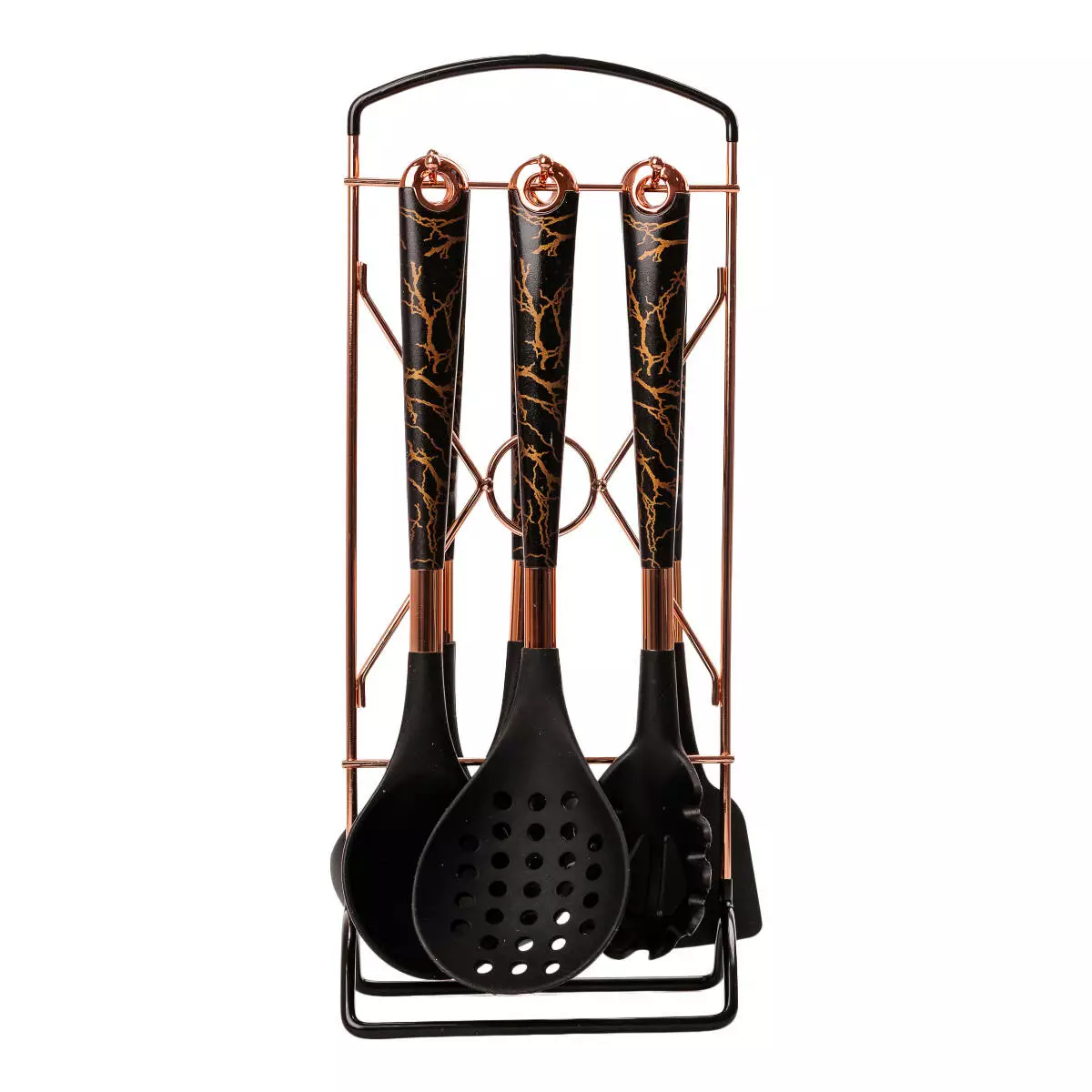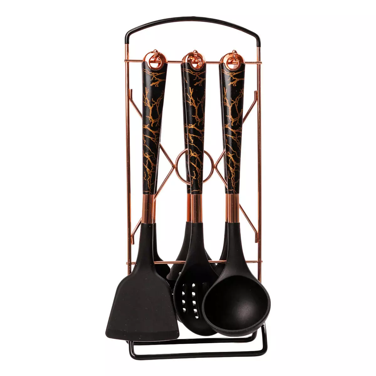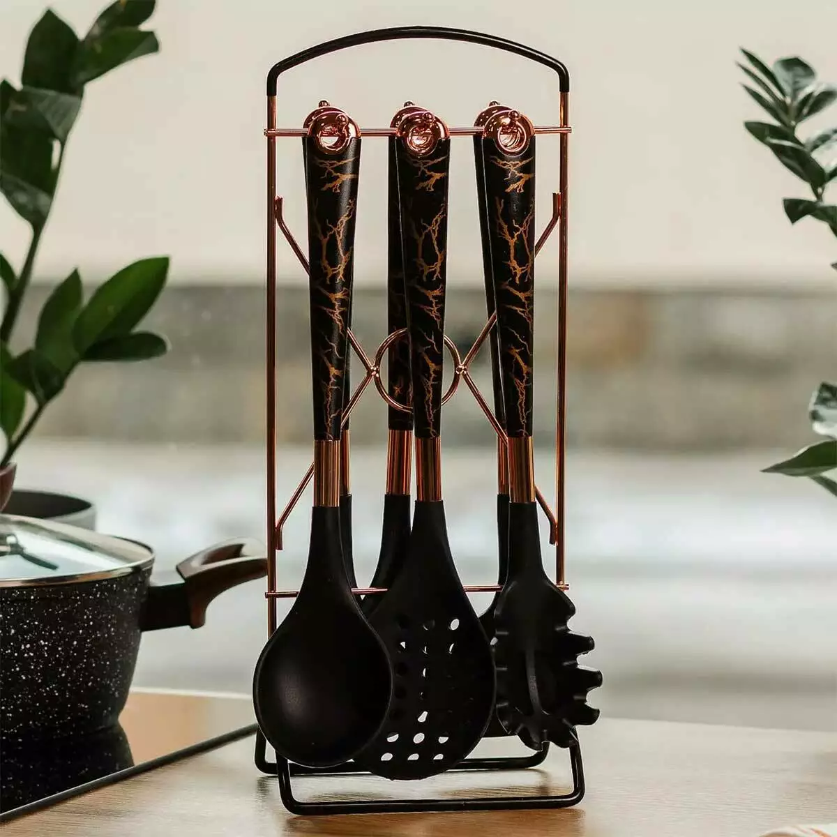 Крім того, в комплект входить зручна підставка для зберігання, що забезпечує порядок та легкий доступ до необхідних інструментів. Цей елегантний та функціональний набір зробить вашу кухню стильною та організованою.