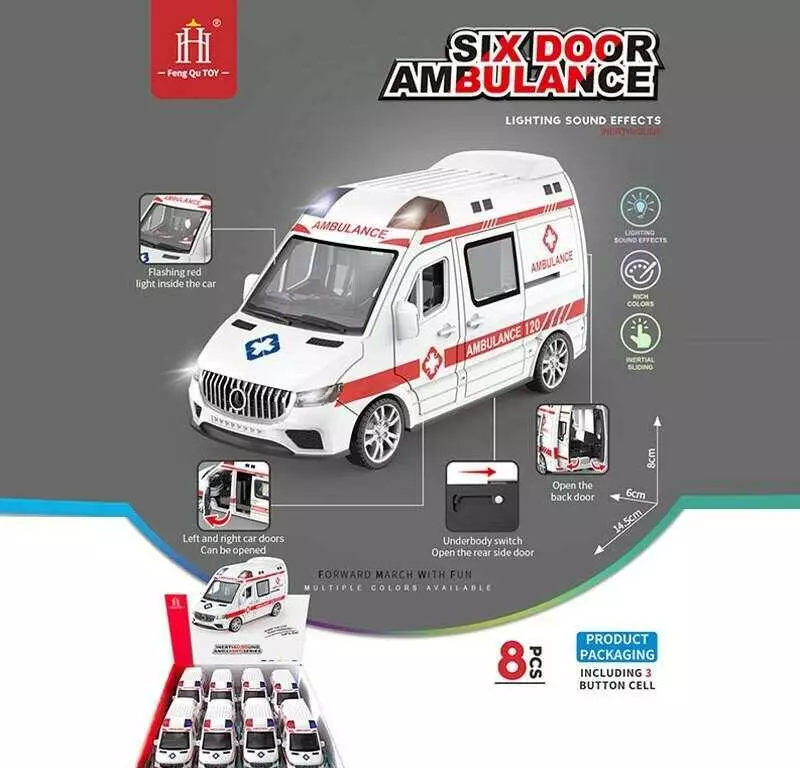 Главная > Каталог > Игрушки > Игрушечные машинки > Набір машин 731-37 D (12) ЦІНА ЗА 8 ШТУК В БЛОЦІ, “Швидка допомога”, розмір - 14.5х6х8 см, інерція, звуки, підсвічування, відкр. двері, в коробці оптом