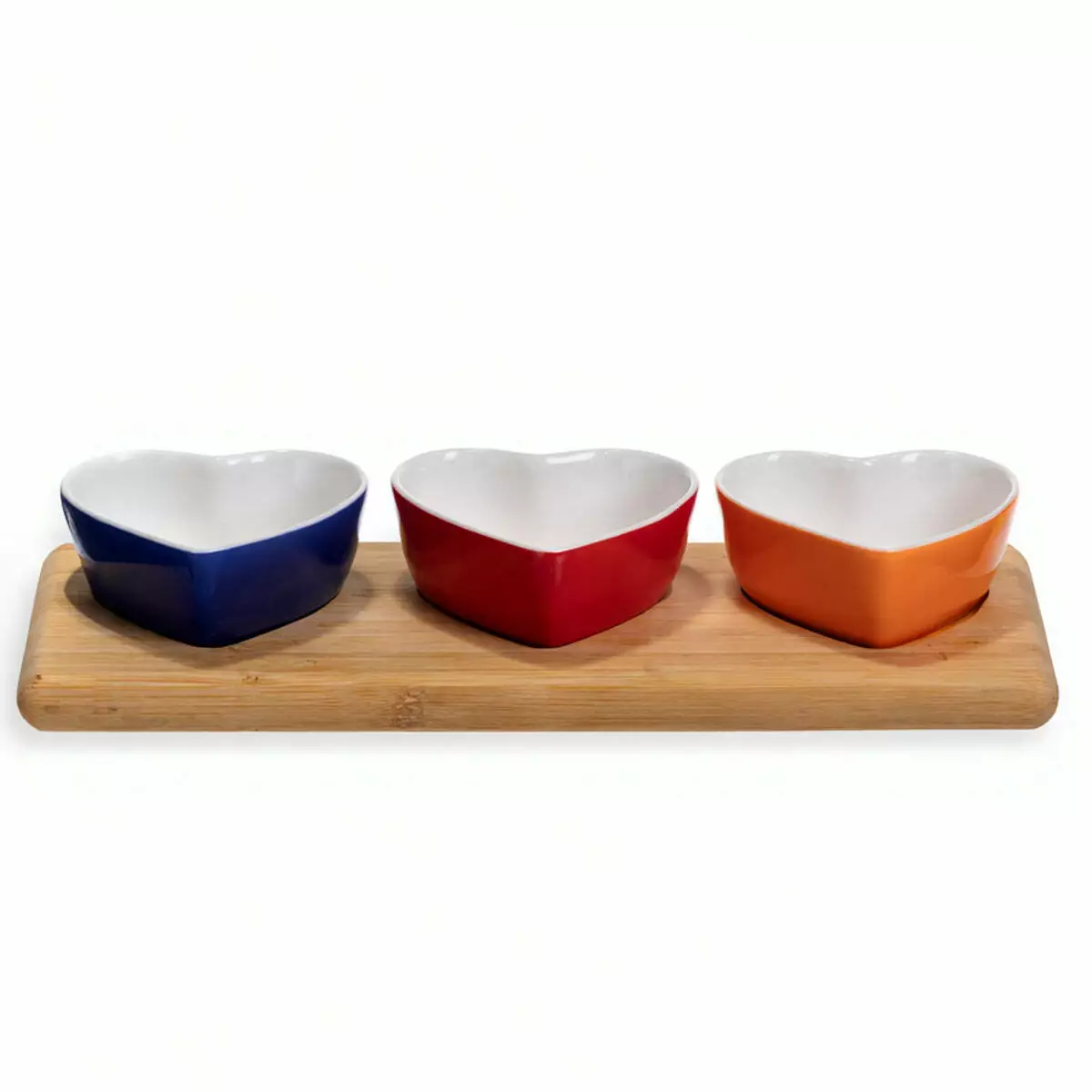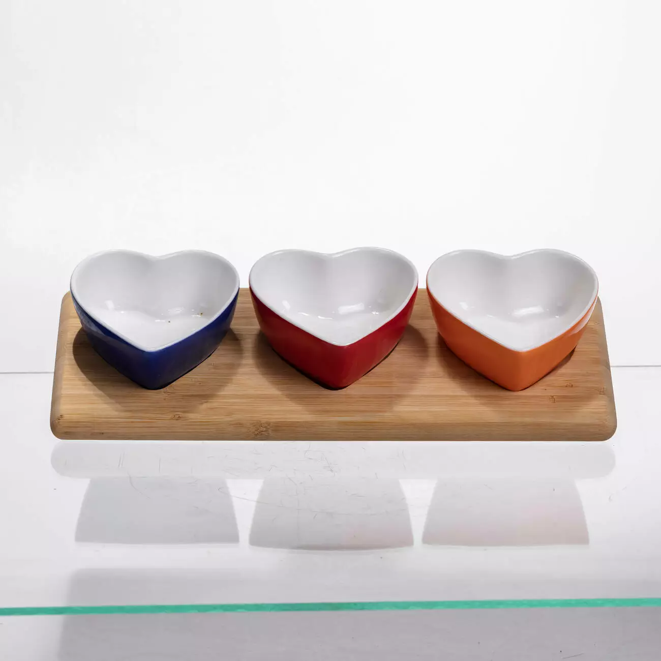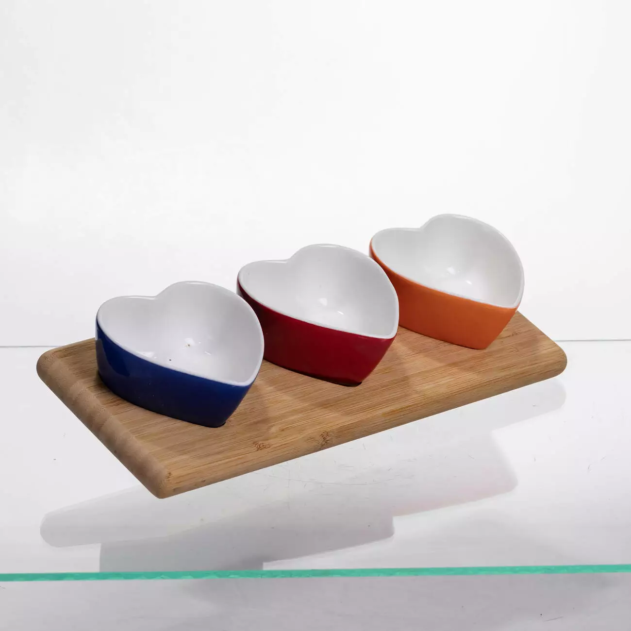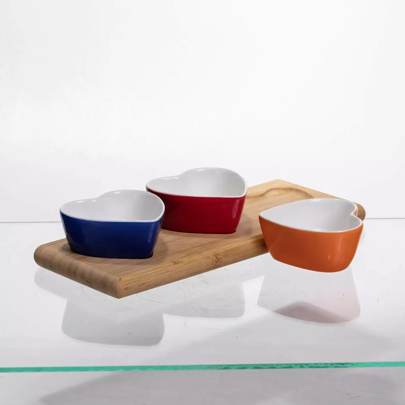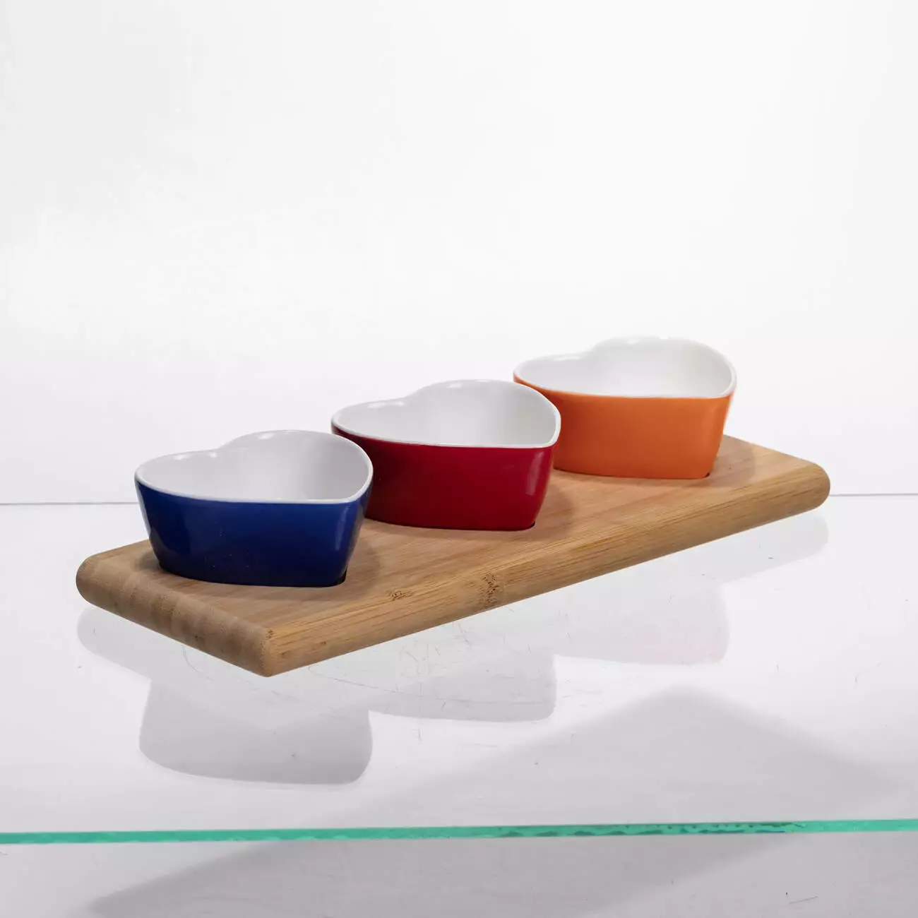 Набір складається з трьох порцелянових менажниць об'ємом по 100 мл, розміщених на прямокутній бамбуковій підставці розміром 28 × 11 см. Кожна менажниця має діаметр 8 см і однакову форму — серцеподібну. Такий формат підходить для подачі соусів, спецій, дрібних закусок або десертних порцій.