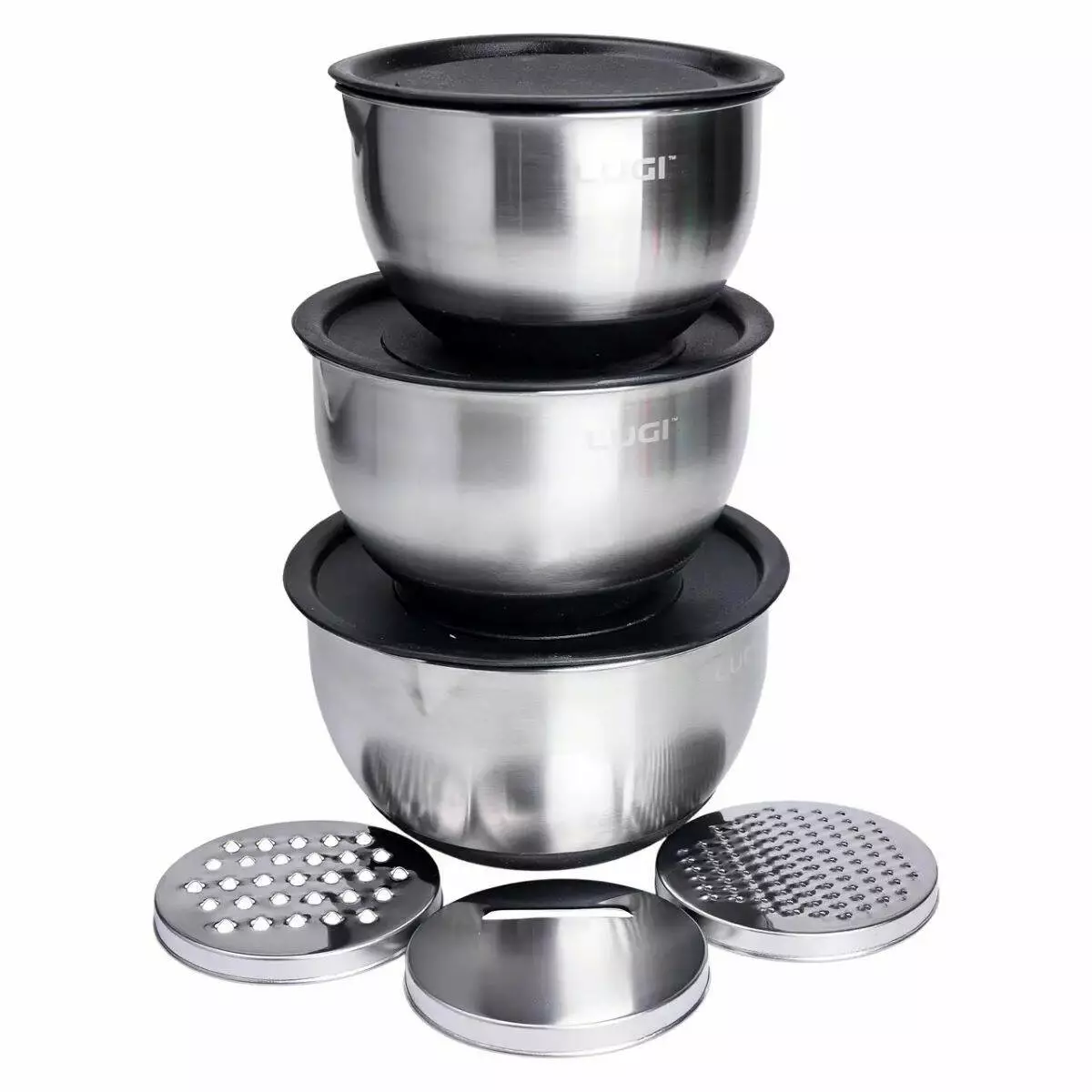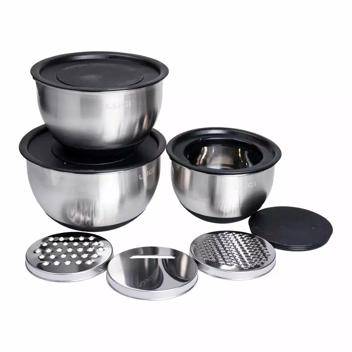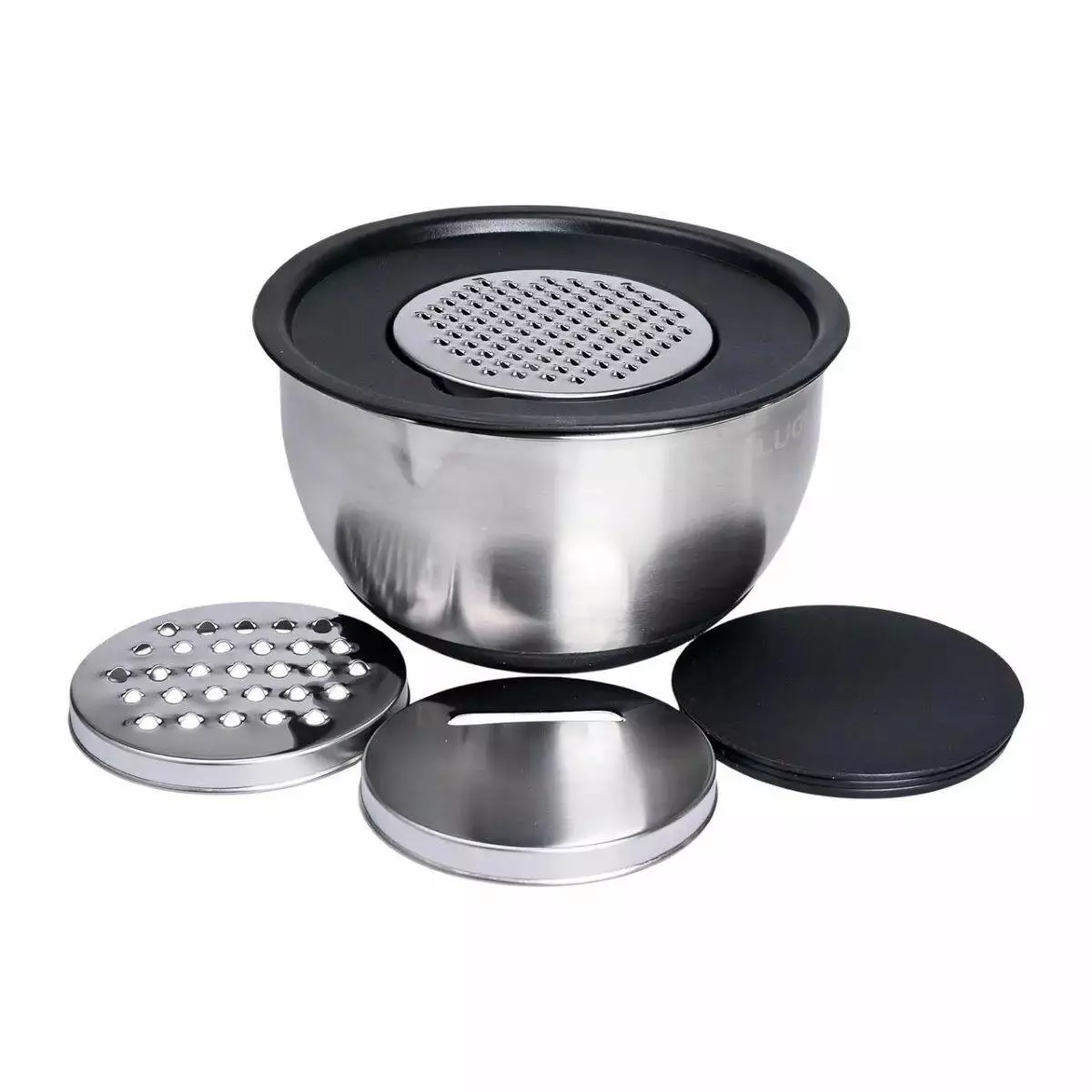 Функціональність набору розширюється завдяки пластиковим кришкам з вирізами для установки терки. Це дозволяє натирати овочі, фрукти або сир прямо в миску, не турбуючись про розсипані інгредієнти. Крім того, кришка запобігає розбризкуванню під час змішування та збивання рідких текстур.