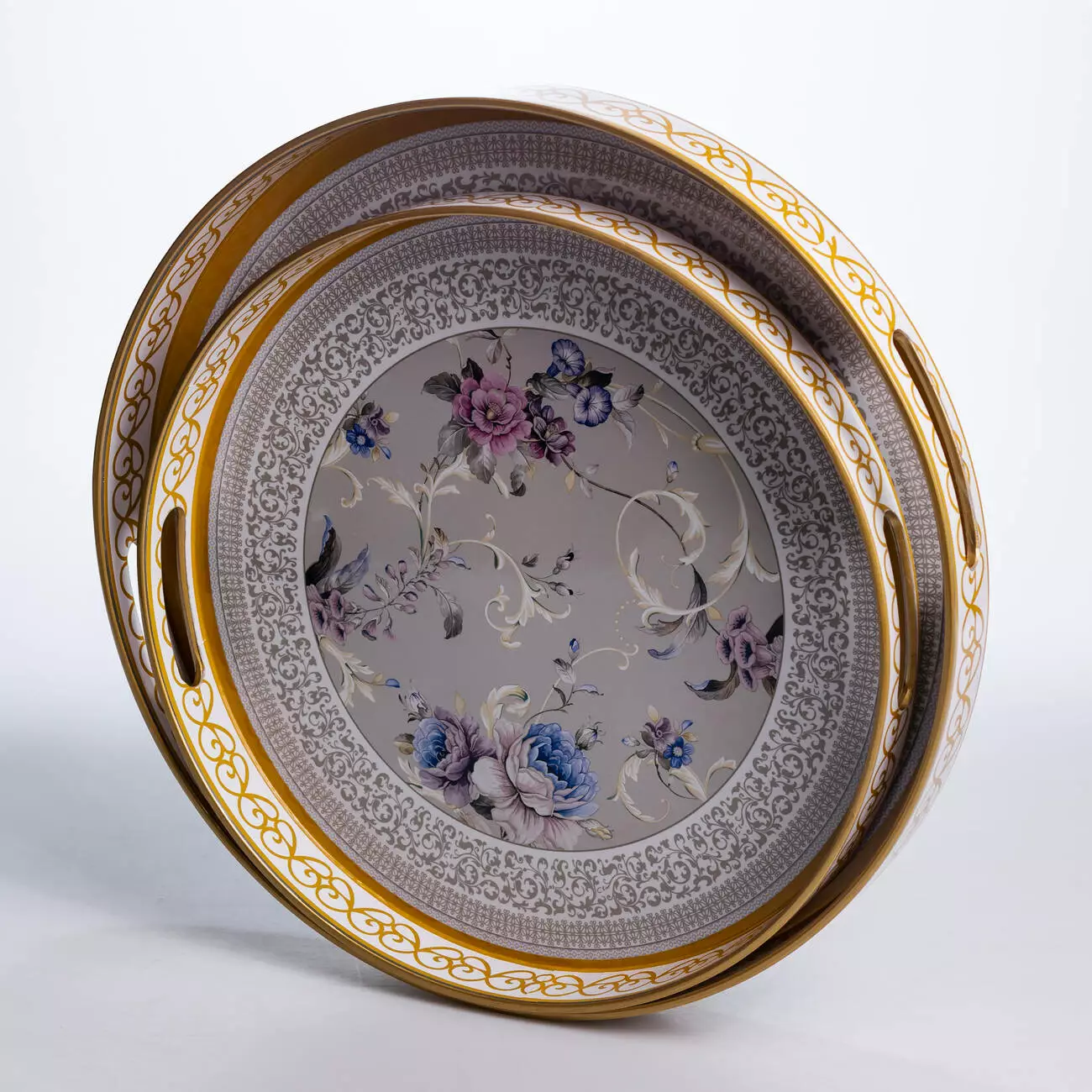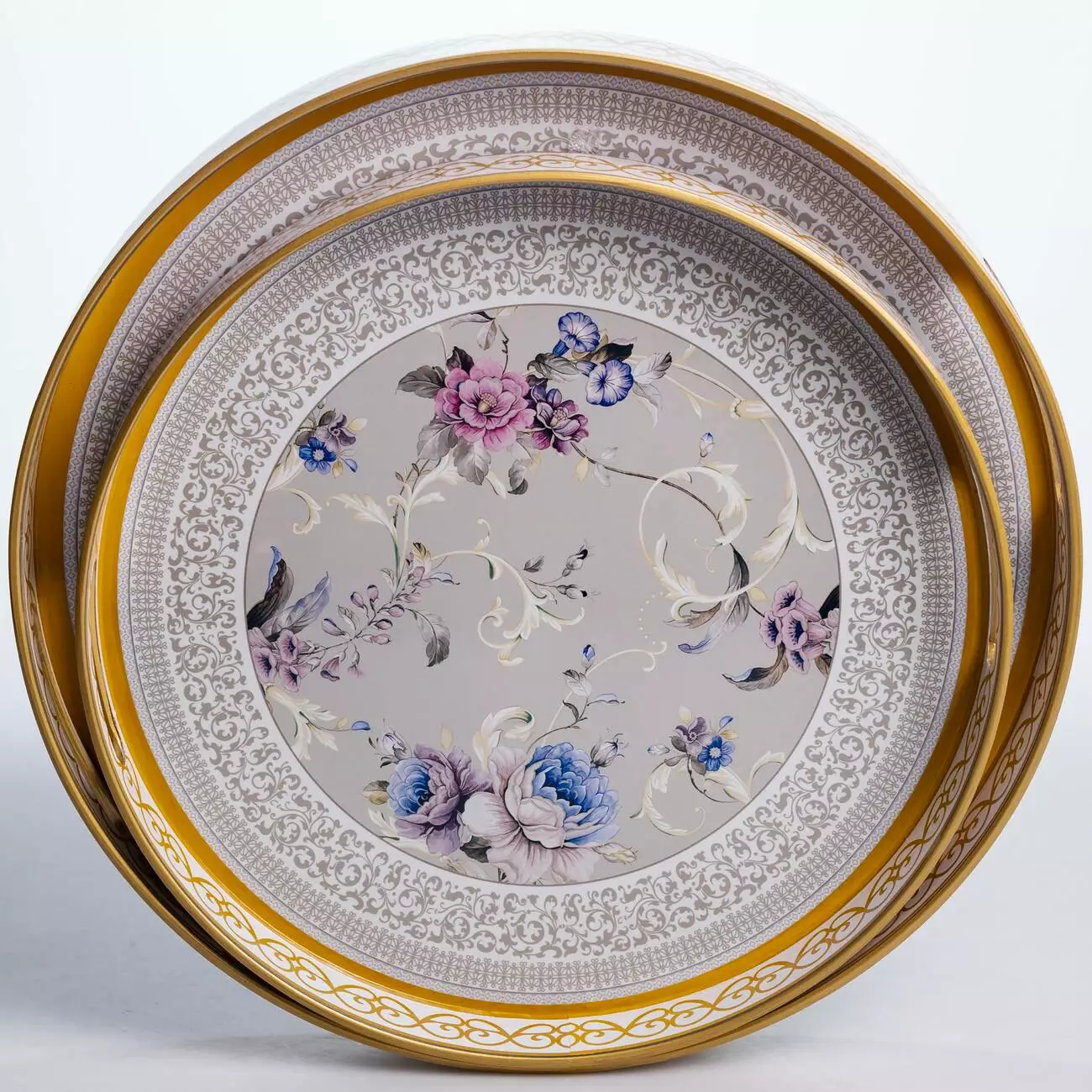 Елегантний набір із двох легких пластикових підносів із витонченим квітковим візерунком ідеальний для сервірування столу та створення домашнього затишку. Таці відмінно підходять для сервірування напоїв, подачі закусок, фруктів, випічки; можна використовувати як декоративну підкладку.