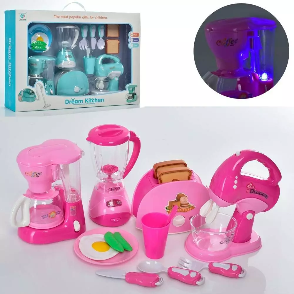 Фотография 1 товарной позиции интернет-магазина детских игрушек www.smarttoys.com.ua Набір побутової техніки YH189-9B-A кавоварка,міксер,тостер,2коль.,муз.,світ,бат.,кор.52,5-37,5-10,5.