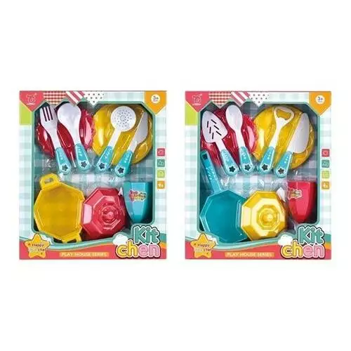 Фотография 1 товарной позиции интернет-магазина детских игрушек www.smarttoys.com.ua Набір посуду 351B кастрюля, сковорода, тарілки, ложка, виделка, 2 види, кор., 21,5-25-4 см.