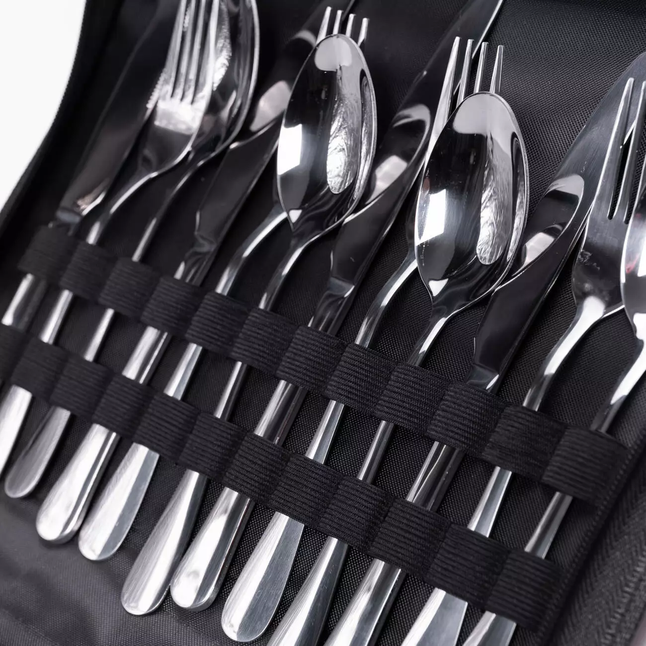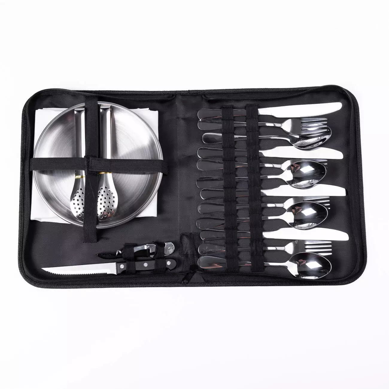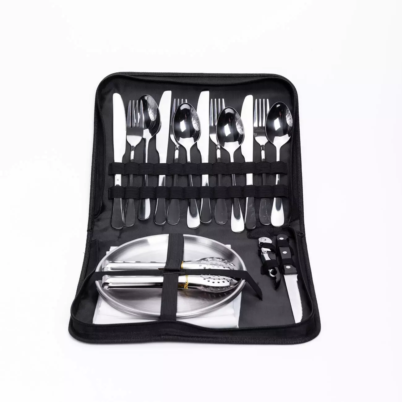 Прибори виготовлені з нержавіючої сталі, що гарантує довговічність і простоту догляду. Довжина кожного столового предмета становить 20 см, що робить їх зручними у використанні. Тарілки, серветки та допоміжні інструменти входять до складу набору, дозволяючи обійтися без додаткових аксесуарів під час виїзду.