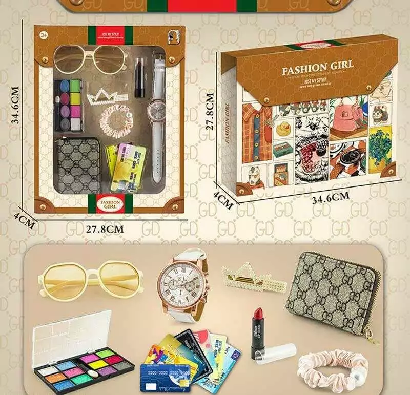 Набір прикрас K 4 (60) годинник, окуляри, резинка та шпилька для волосся, помада, гаманець, тіні для повік та імітація банківських карток, в коробці