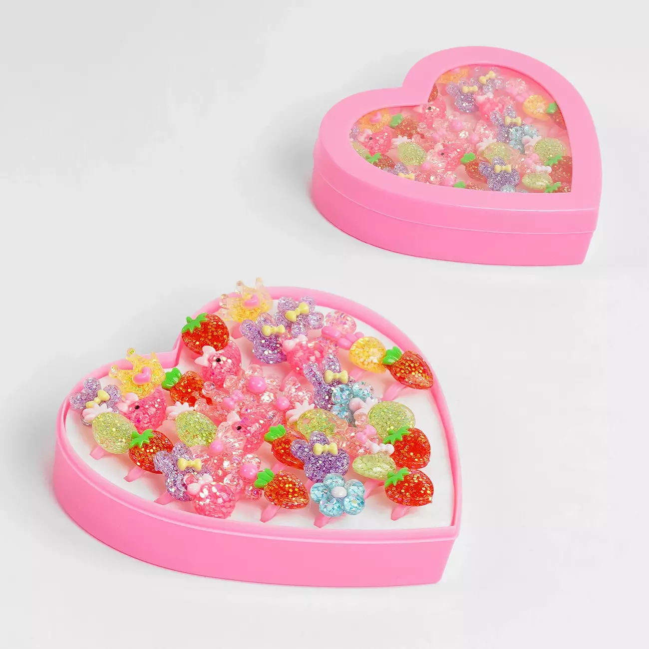 Набір прикрас С 55926 стане ідеальним подарунком для поціновувачки краси та стилю! Кожна каблучка в наборі має виняткову елегантність, яка закохує в себе з першого погляду. Яскраві аксесуари будуть витончено виблискувати на тонких дитячих пальчиках і додадуть будь-якому образу урочистості та ошатності! Особливості: - продаються по 36 штук у коробці; - рожева пластикова основа; - кільце з блискучим елементів різних форм; - зручний бокс у вигляді сердечка для зберігання кілець; - відмінно доповнять будь-який модний образ.